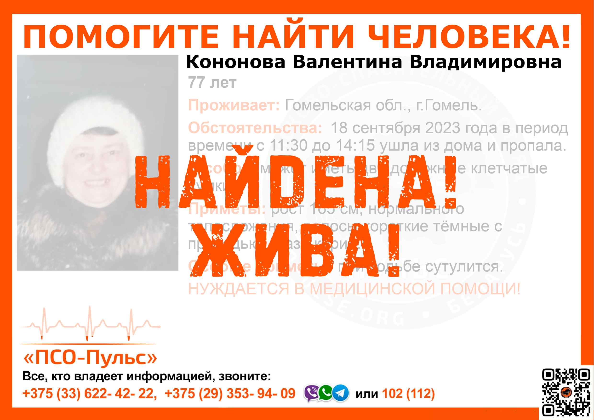 Всех, кто владеет информацией, просим сообщить: ПСО "ПСО-Пульс" +375(33)622-4222 |