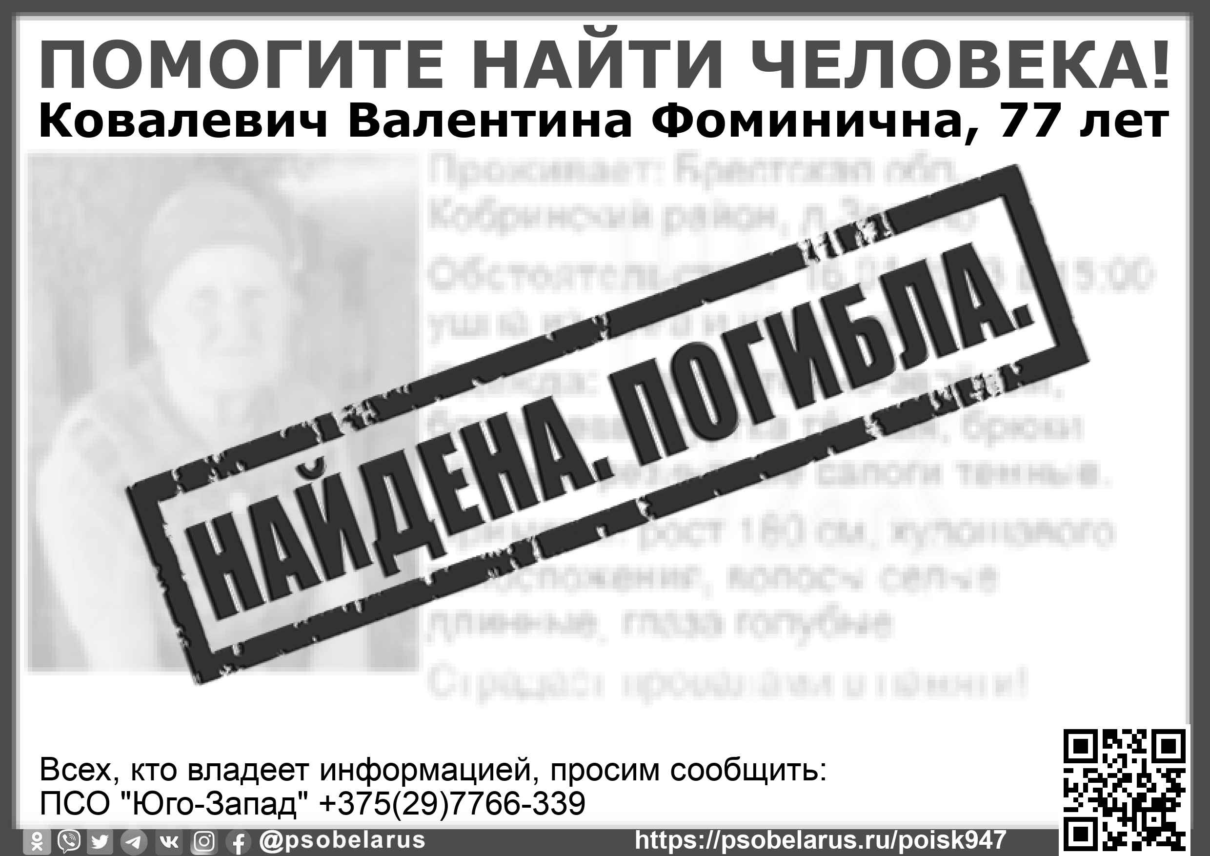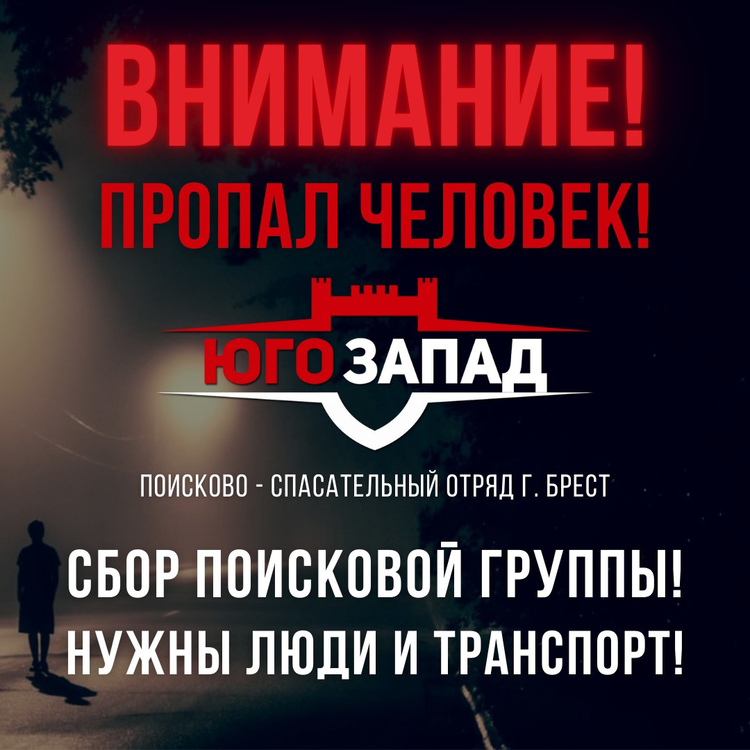 Всех, кто владеет информацией, просим сообщить: ПСО "Юго-Запад" +375(29)7766-339 |