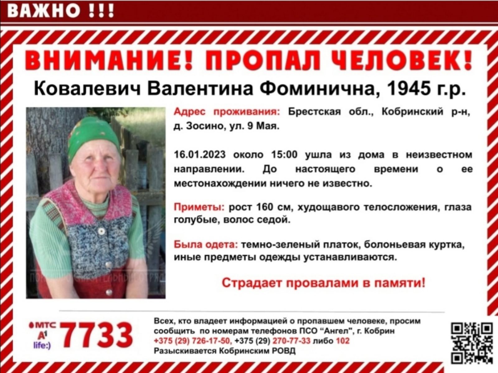 Скачать ориентировкуДля оперативного получения информации о пропавших людях и сборах на поиски можно подписаться на бота оповещения: Телеграм