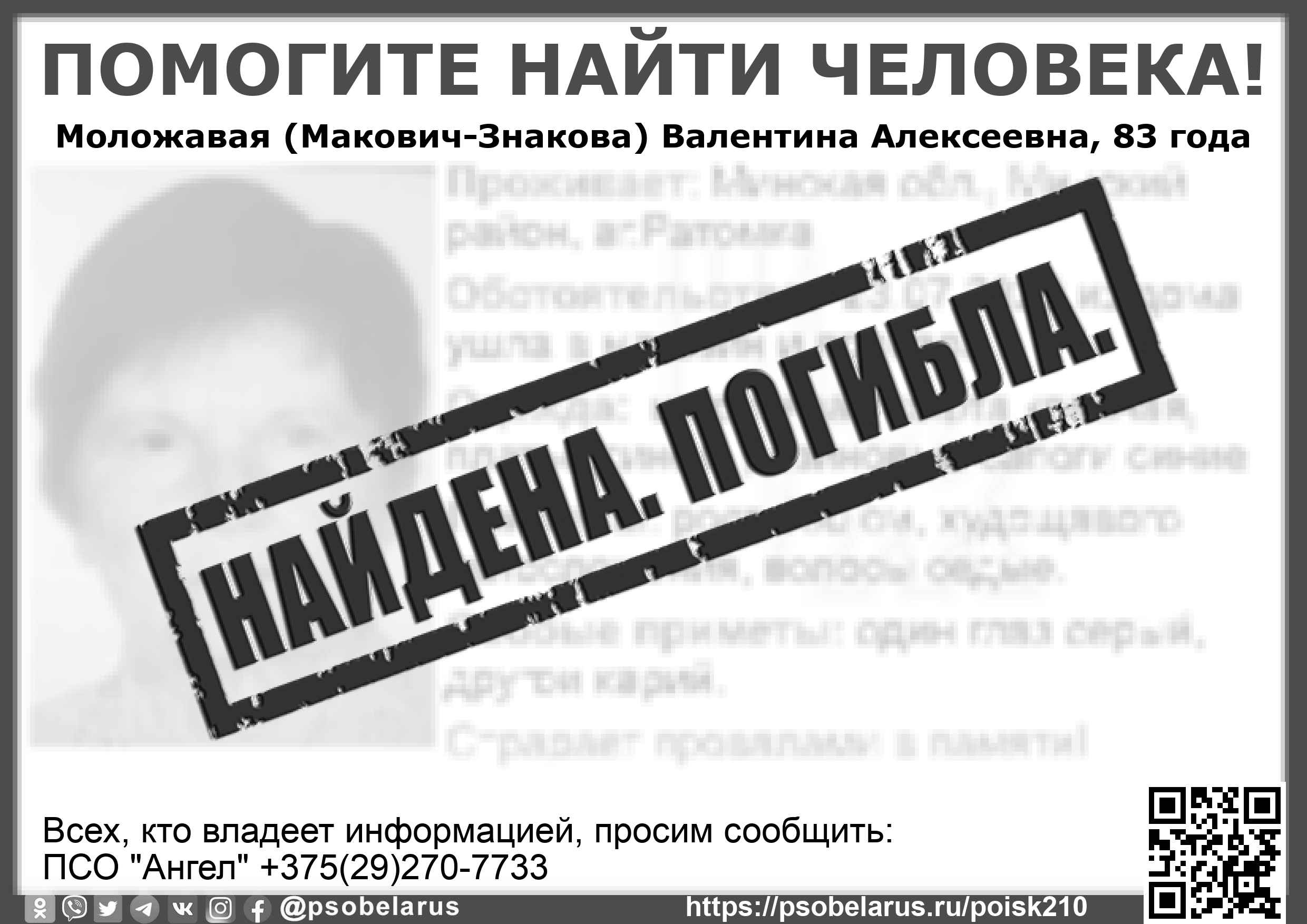 Всех, кто владеет информацией, просим сообщить: ПСО "Ангел" +375(29)270-7733 |