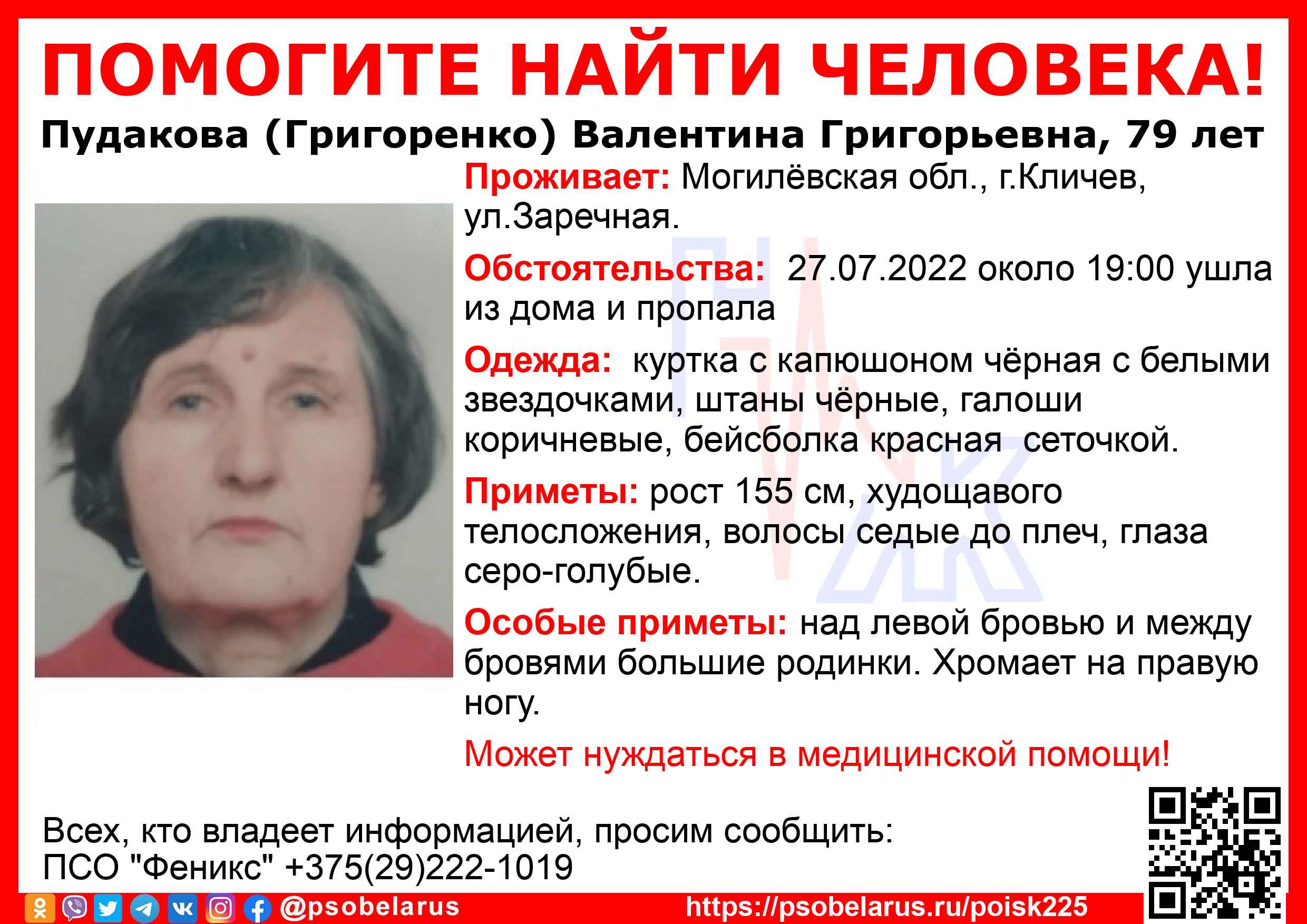 Скачать ориентировкуДля оперативного получения информации о пропавших людях и сборах на поиски можно подписаться на бота оповещения: Телеграм