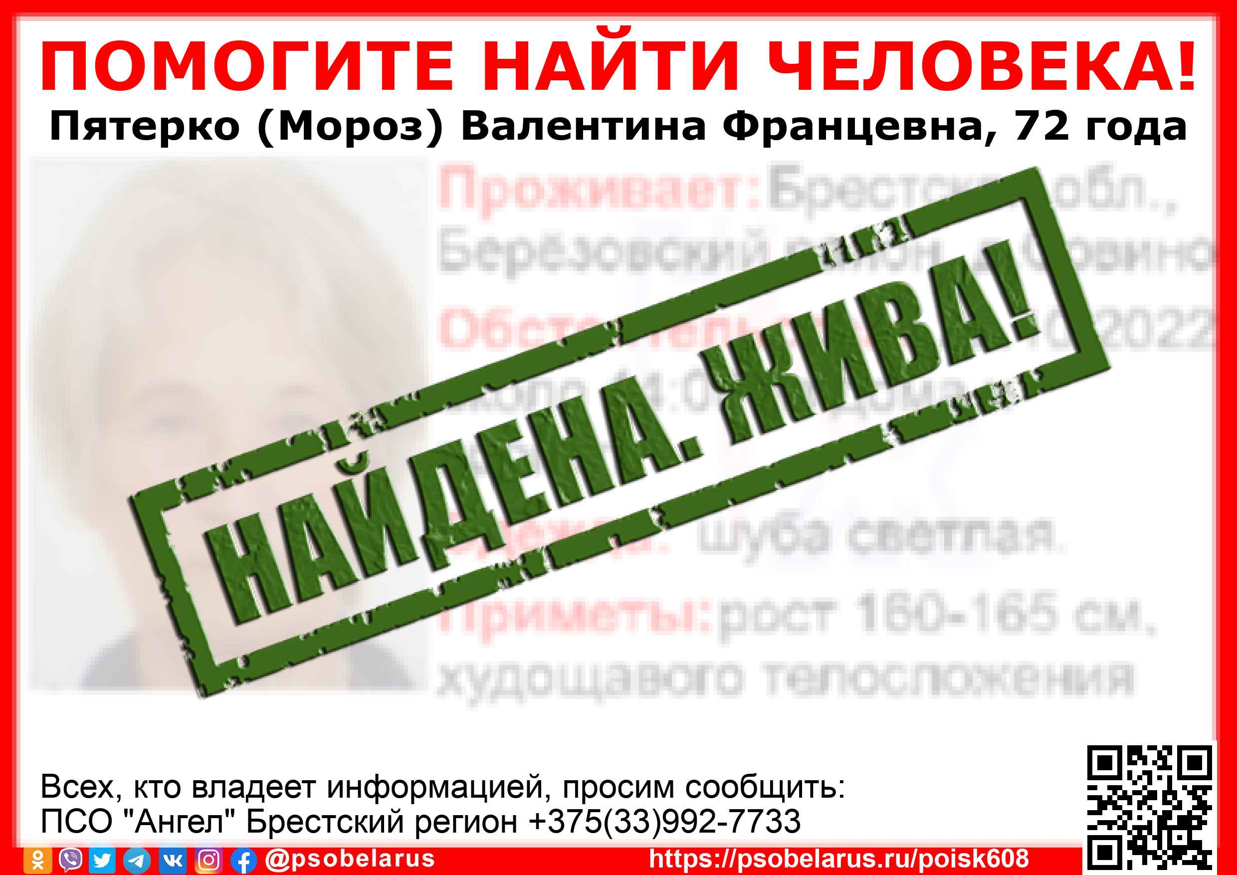 Всех, кто владеет информацией, просим сообщить: ПСО "Ангел" Брестский регион +375(33)992-7733 |