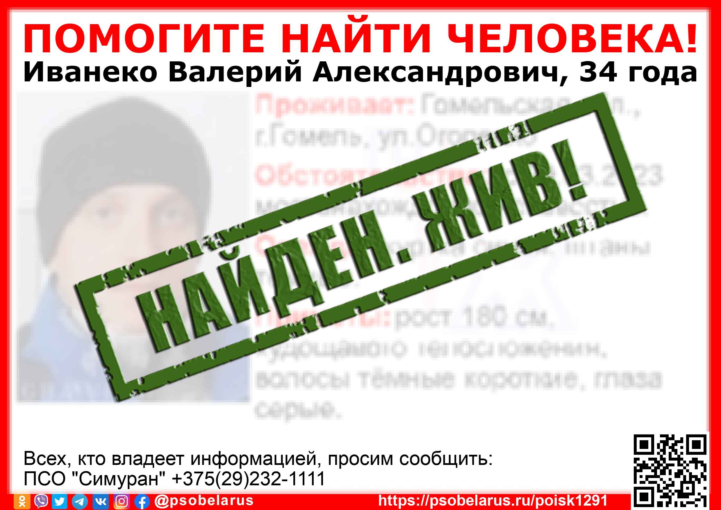 Всех, кто владеет информацией, просим сообщить: ПСО "Симуран" +375(29)232-1111 |
