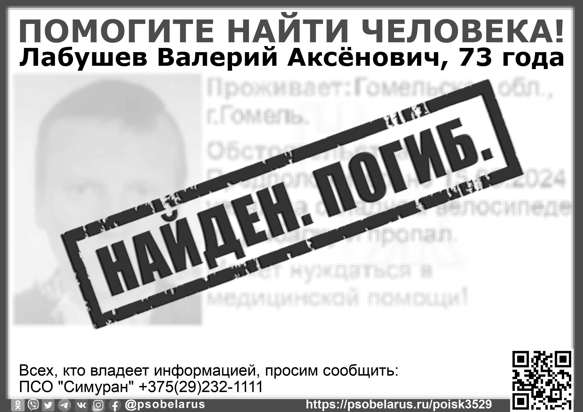 Всех, кто владеет информацией, просим сообщить: ПСО "Симуран" +375(29)232-1111 |