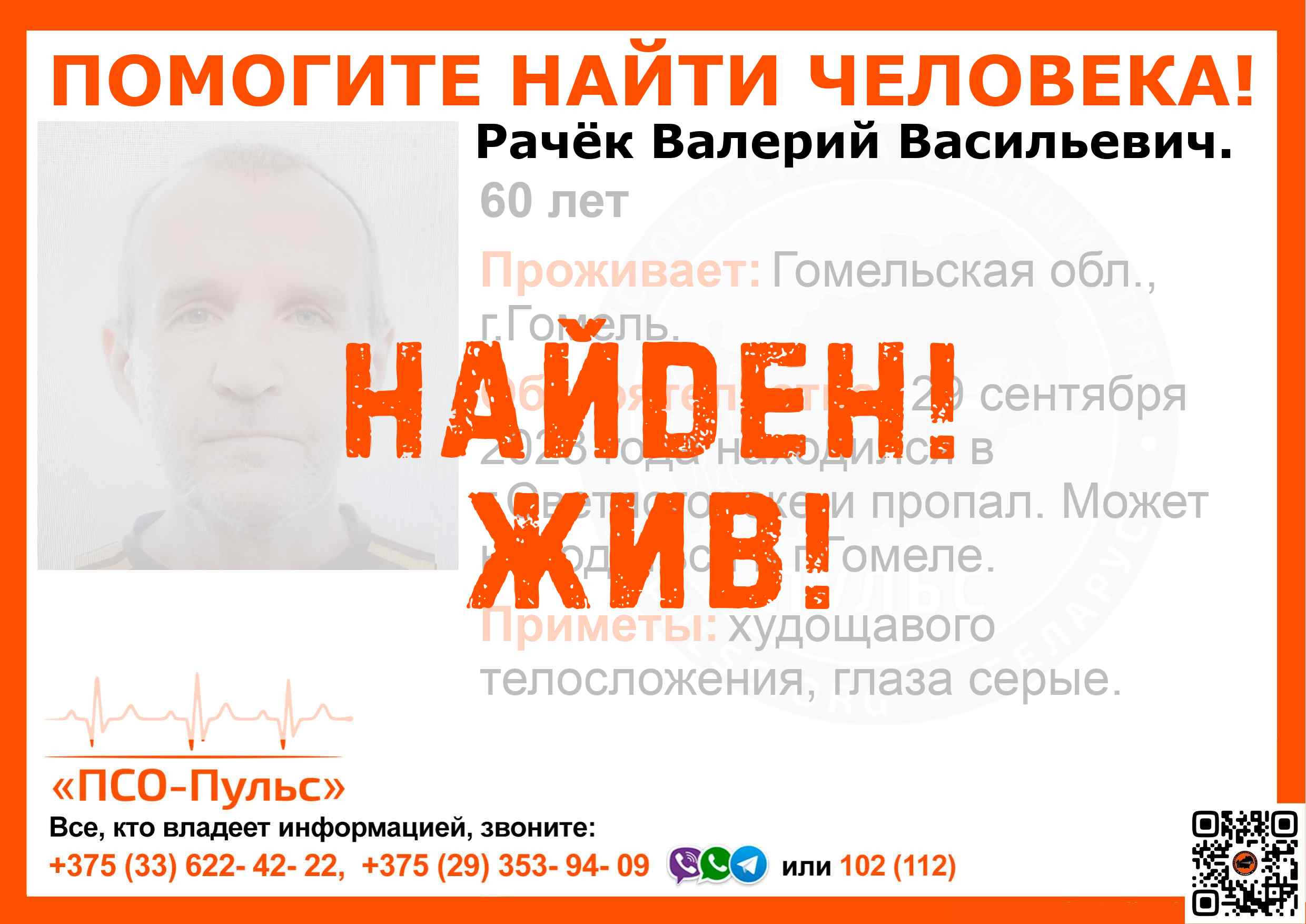 Всех, кто владеет информацией, просим сообщить: ПСО "ПСО-Пульс" +375(33)622-4222 |