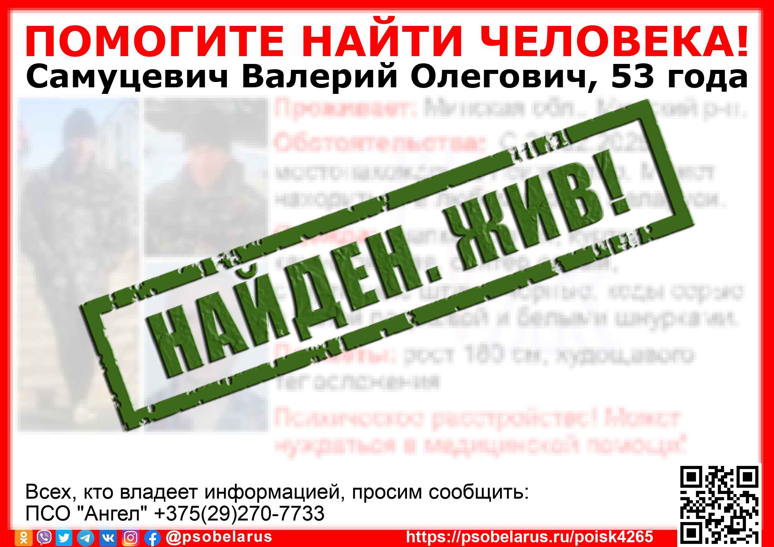 Всех, кто владеет информацией, просим сообщить: ПСО "Ангел" +375(29)270-7733 |