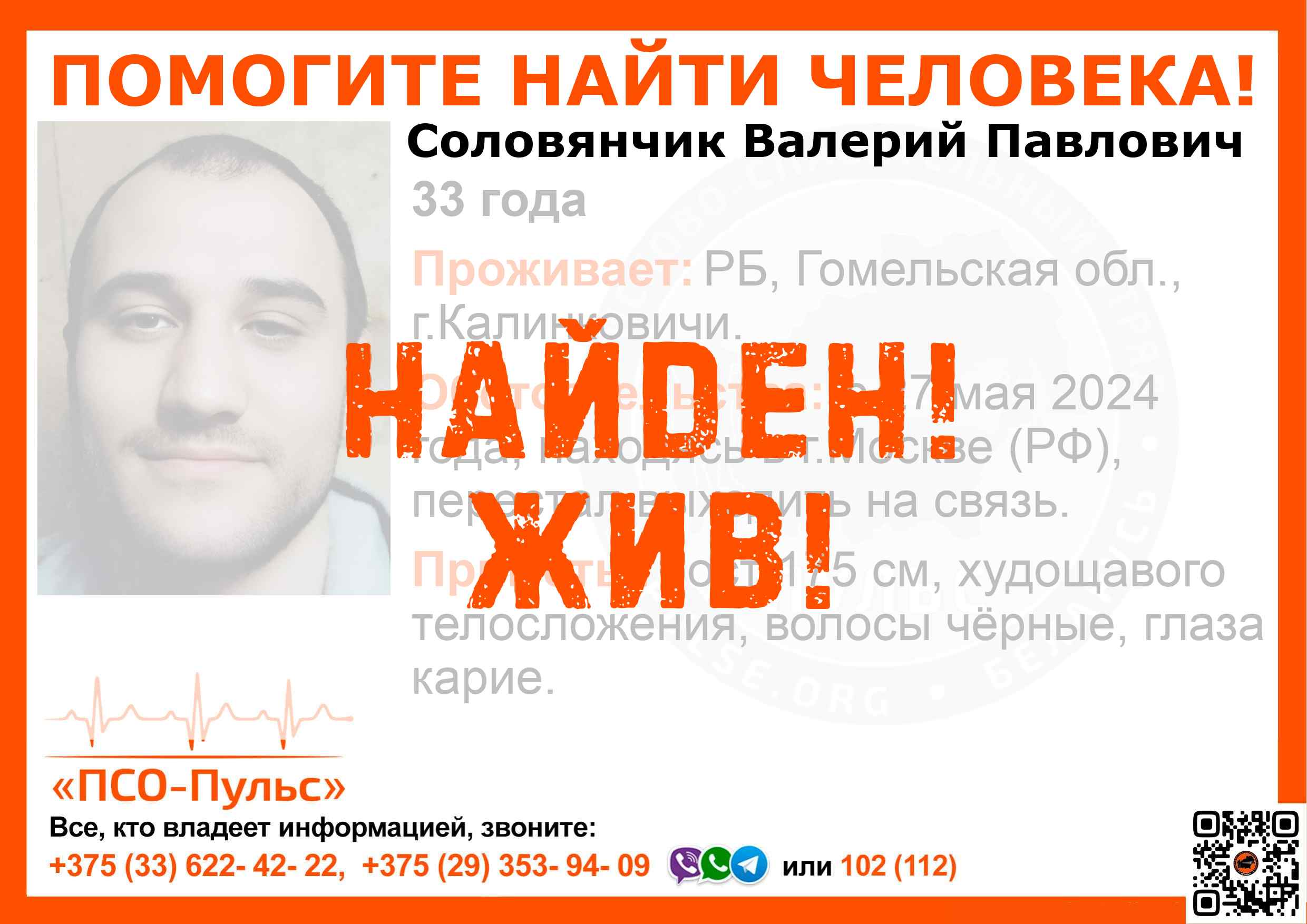 Всех, кто владеет информацией, просим сообщить: ПСО "ПСО-Пульс" +375(33)622-4222 |