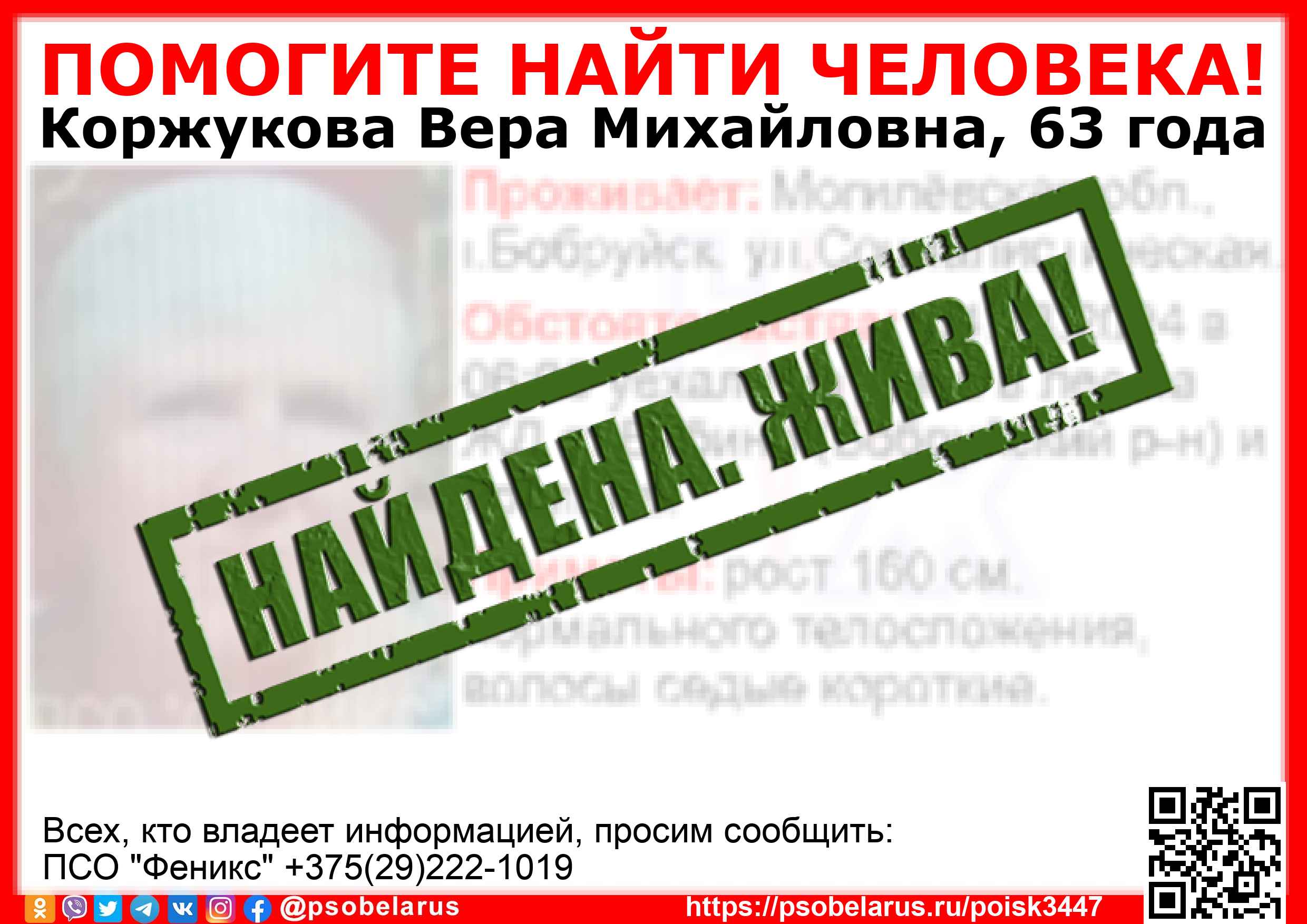 Всех, кто владеет информацией, просим сообщить: ПСО "Феникс" +375(29)222-1019 |