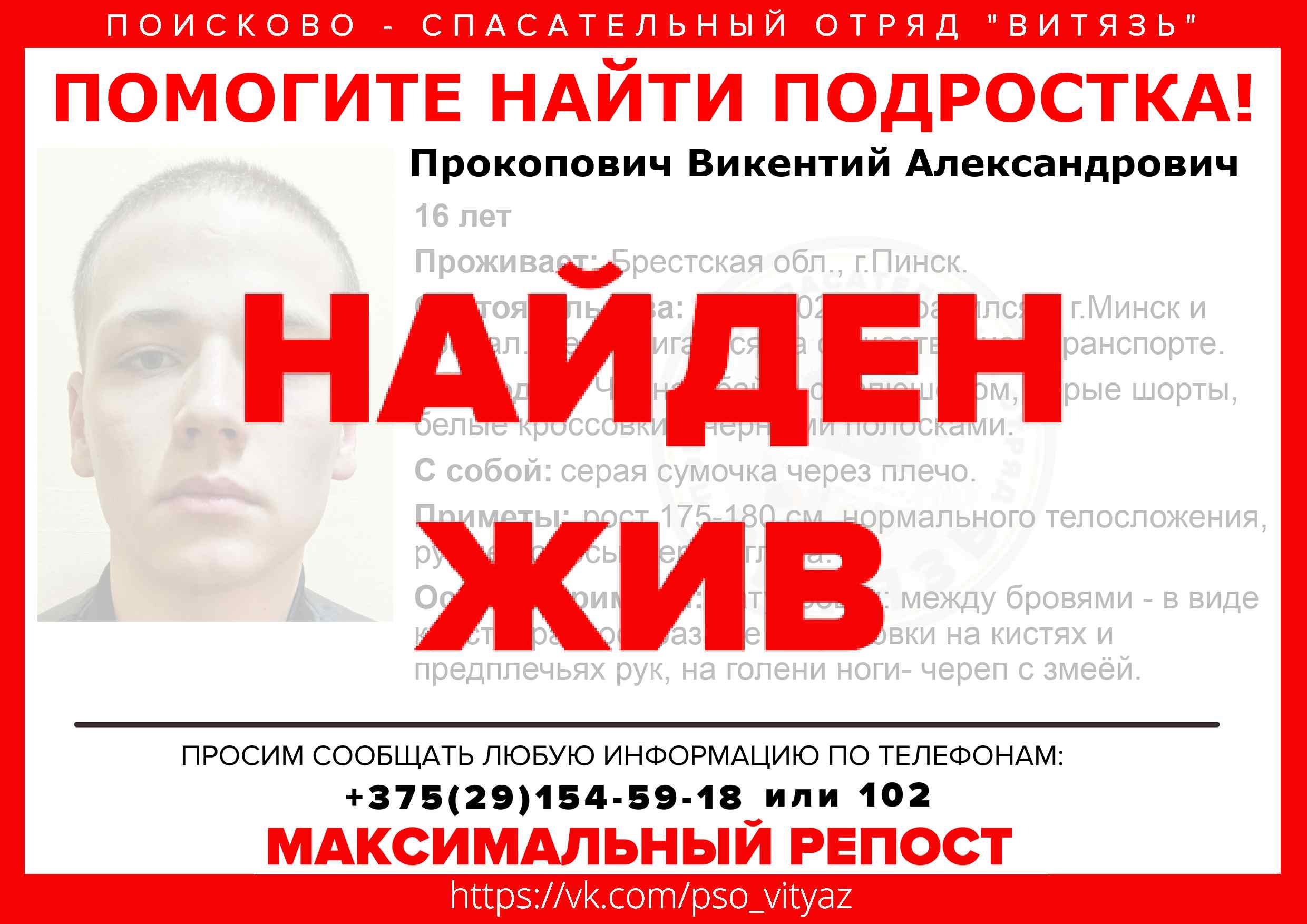 Всех, кто владеет информацией, просим сообщить: ПСО "ВИТЯЗЬ" +375(29)154-59-18 |