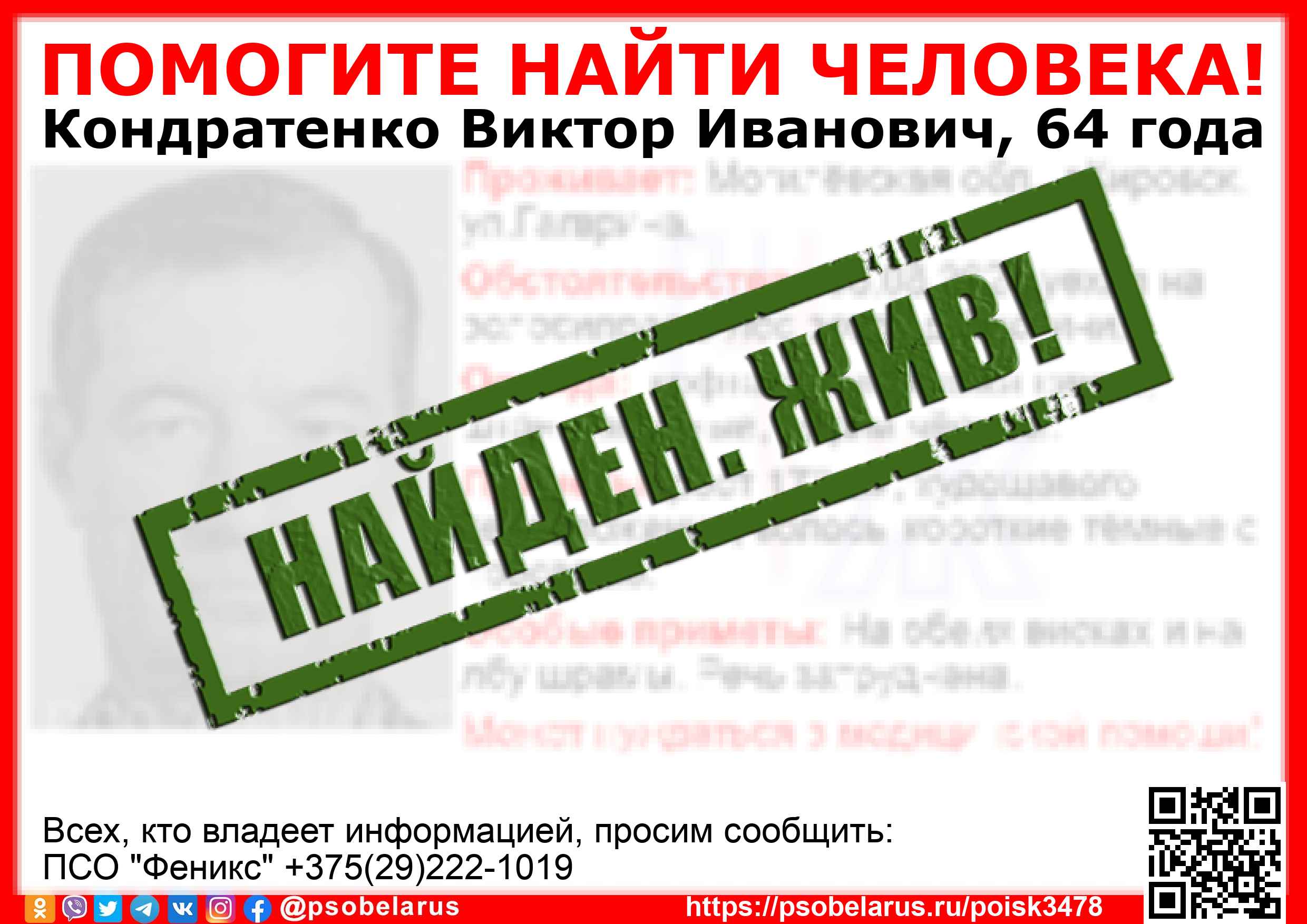 Всех, кто владеет информацией, просим сообщить: ПСО "Феникс" +375(29)222-1019 |