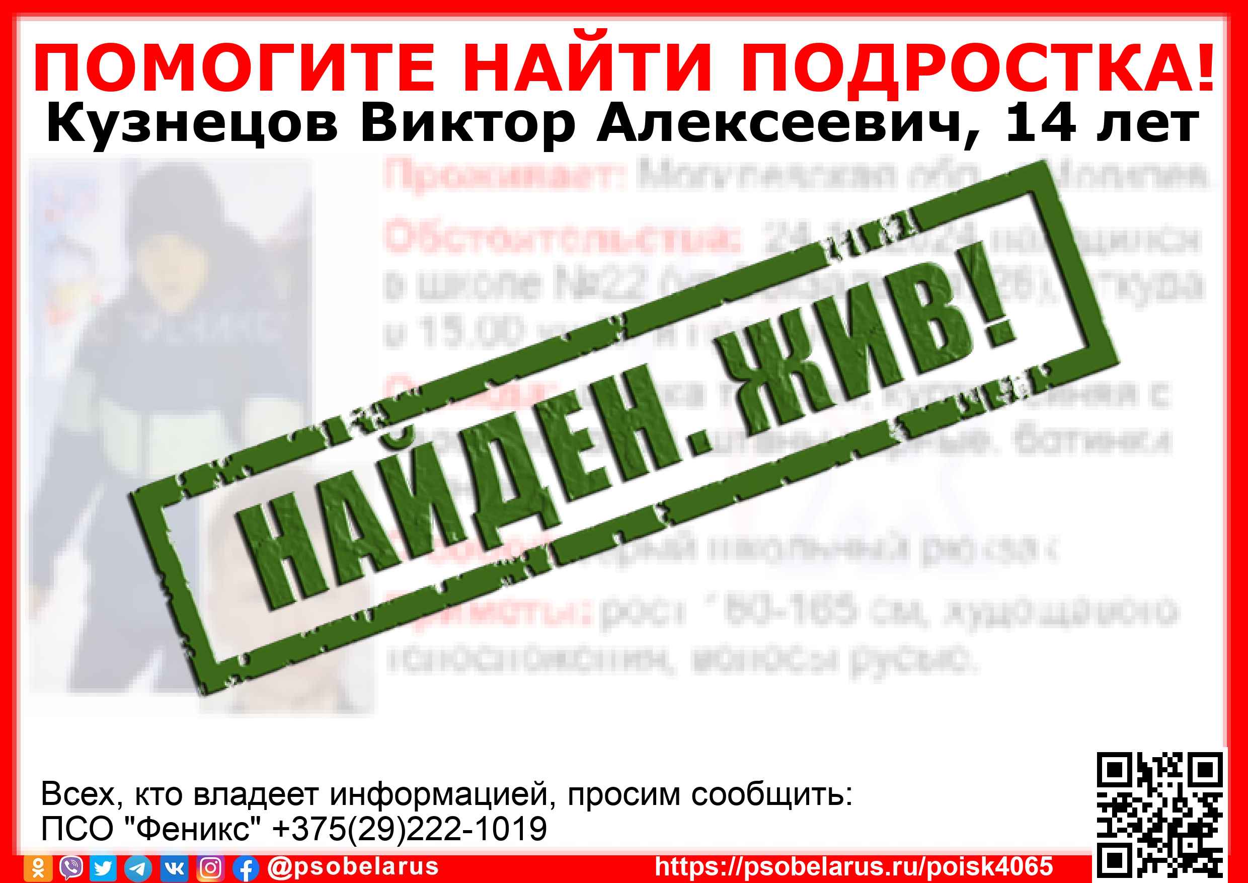 | Всех, кто владеет информацией, просим сообщить: ПСО "Феникс" +375(29)222-1019 |  |