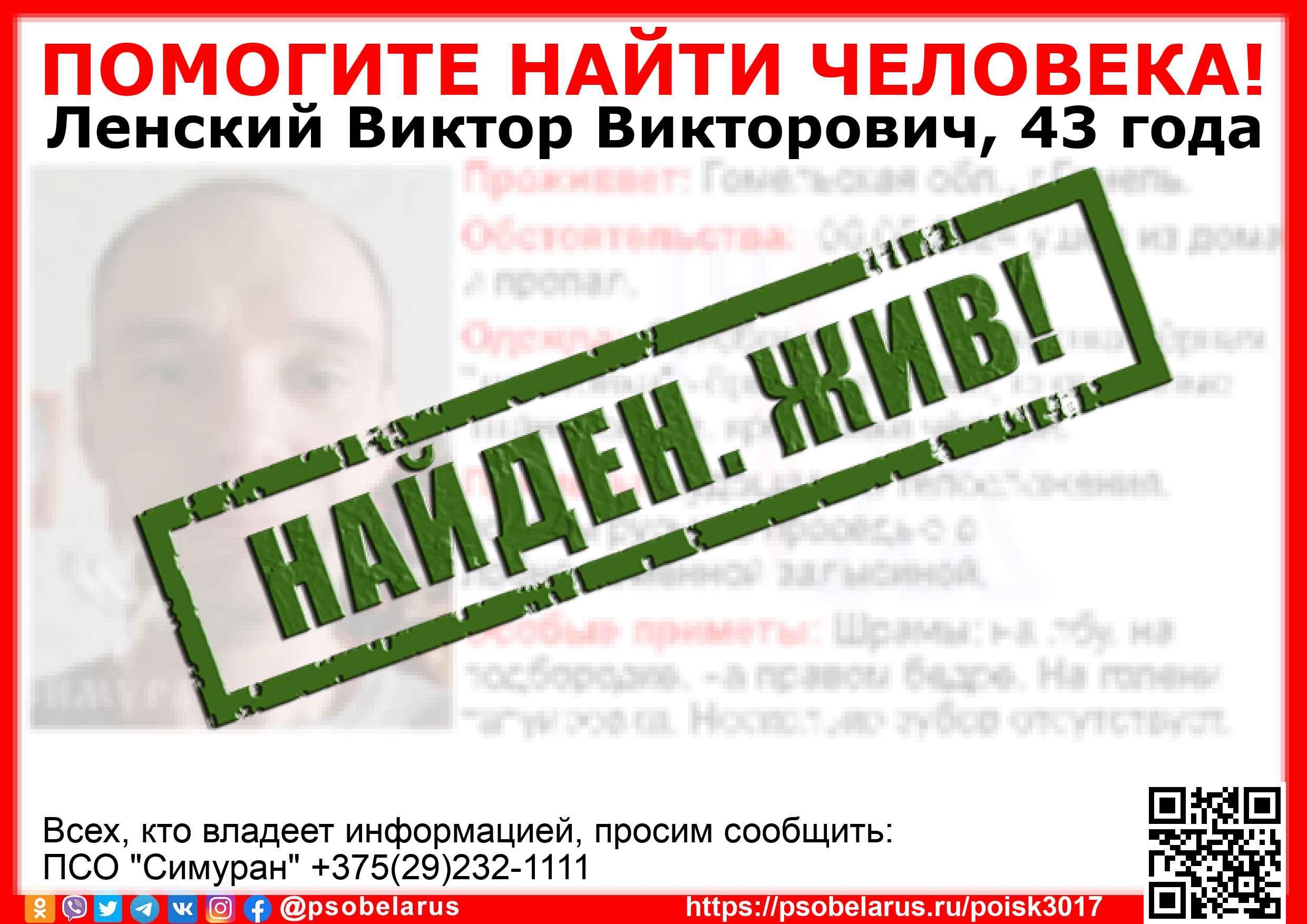 Всех, кто владеет информацией, просим сообщить: ПСО "Симуран" +375(29)232-1111 |