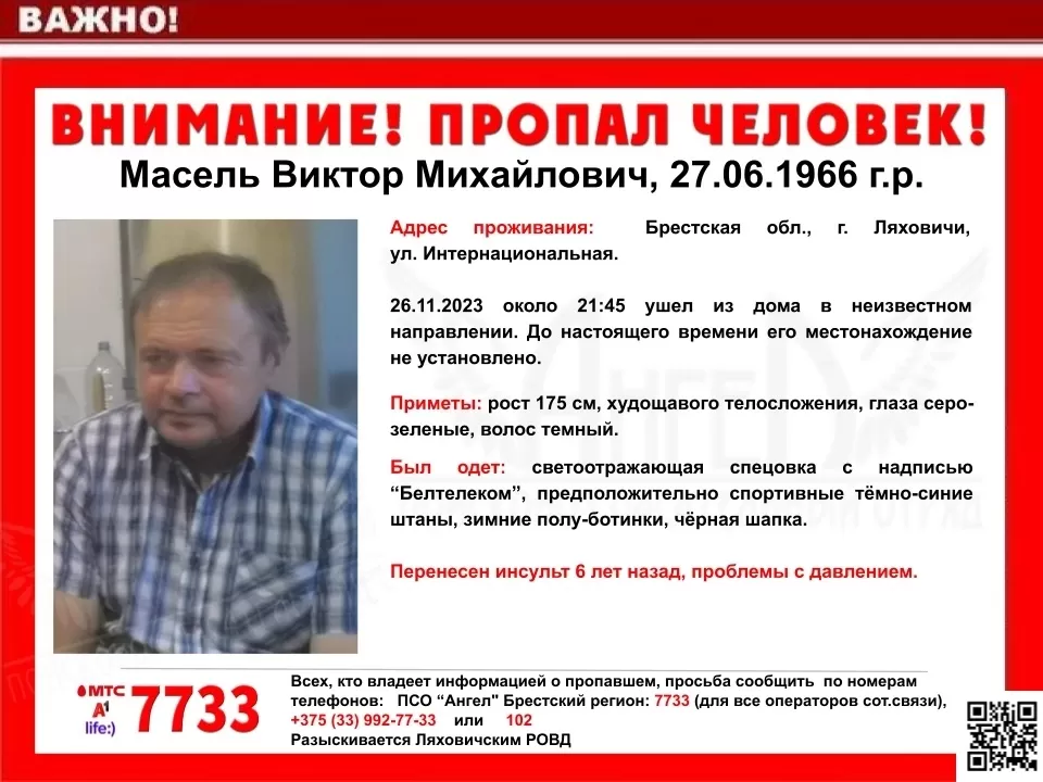 Всех, кто владеет информацией, просим сообщить: ПСО "Ангел" Брестский регион +375(33)992-7733 |
