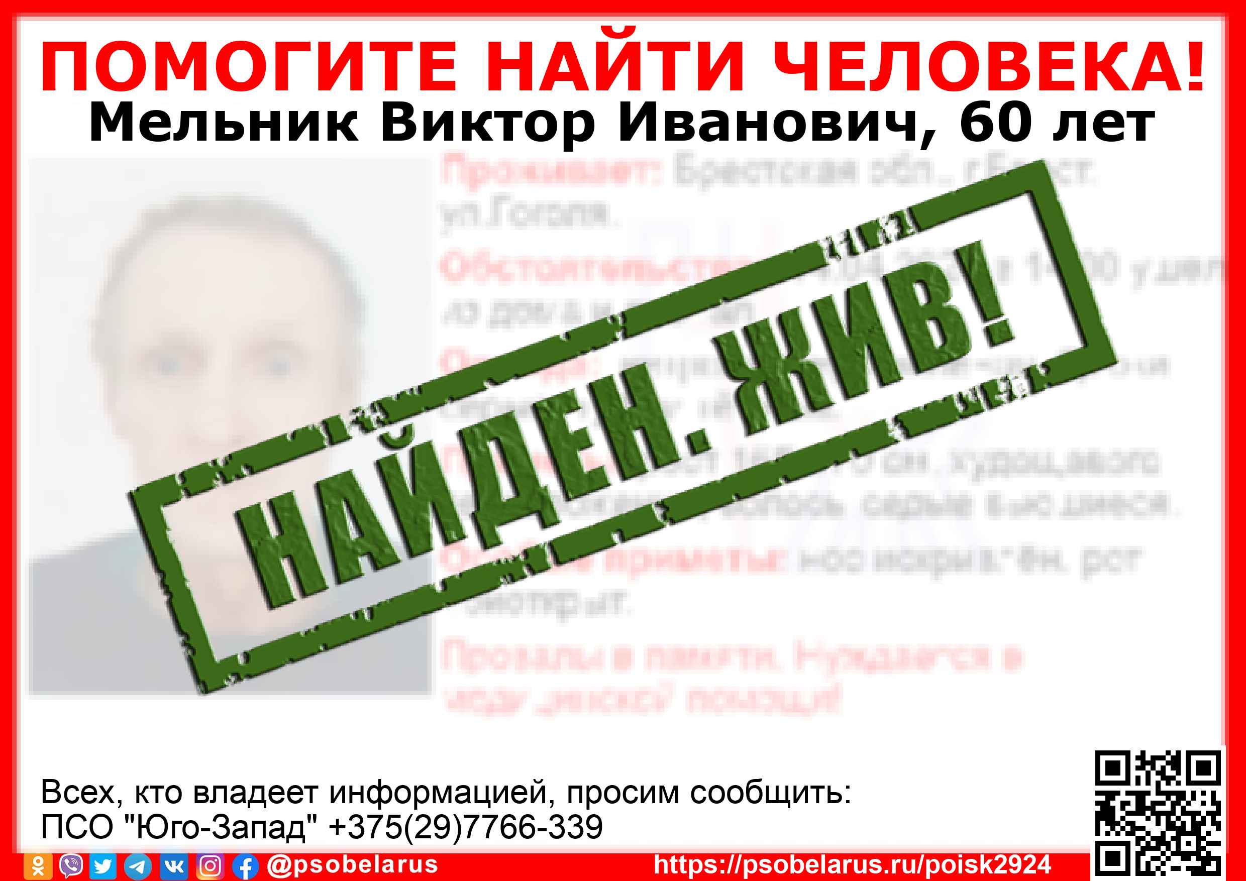 Всех, кто владеет информацией, просим сообщить: ПСО "Юго-Запад" +375(29)7766-339 |