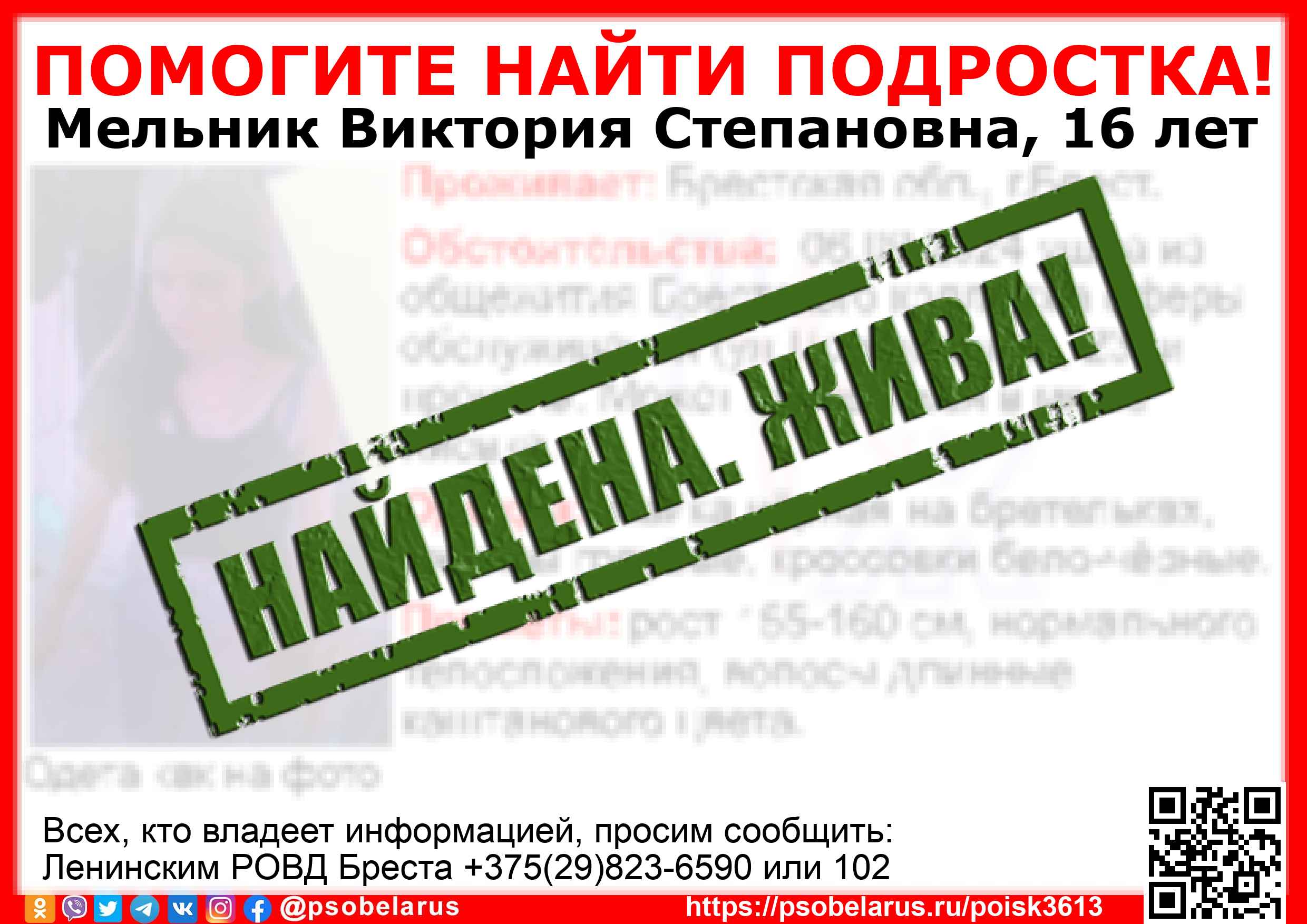Всех, кто владеет информацией, просим сообщить: Ленинским РОВД Бреста +375(29)823-6590 или 102 |