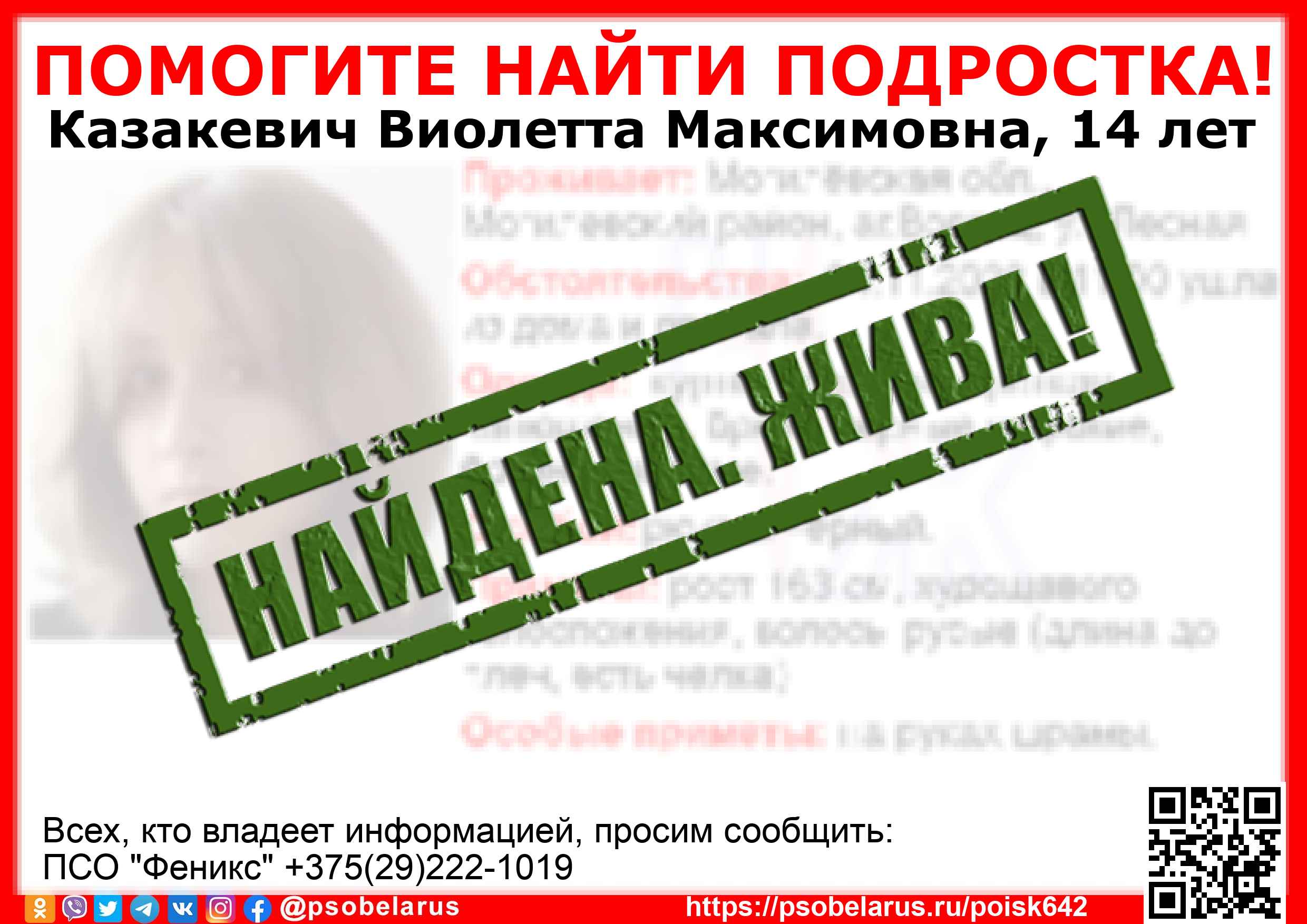 Всех, кто владеет информацией, просим сообщить: ПСО "Феникс" +375(29)222-1019 |
