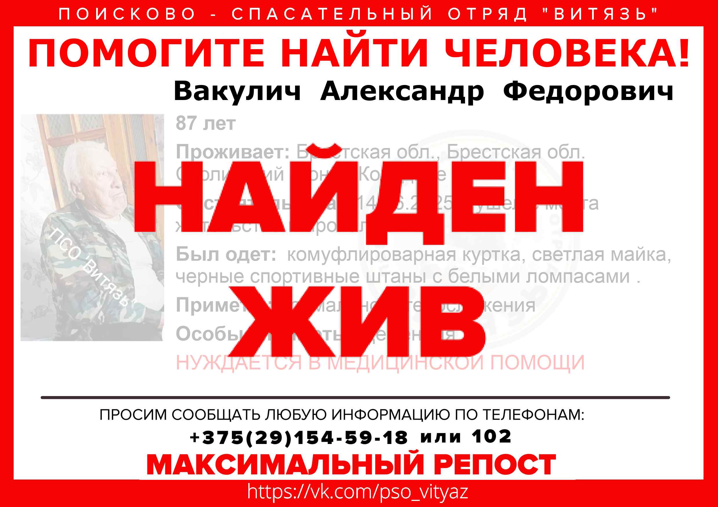Всех, кто владеет информацией, просим сообщить: ПСО "ВИТЯЗЬ" +375(29)154-59-18 |