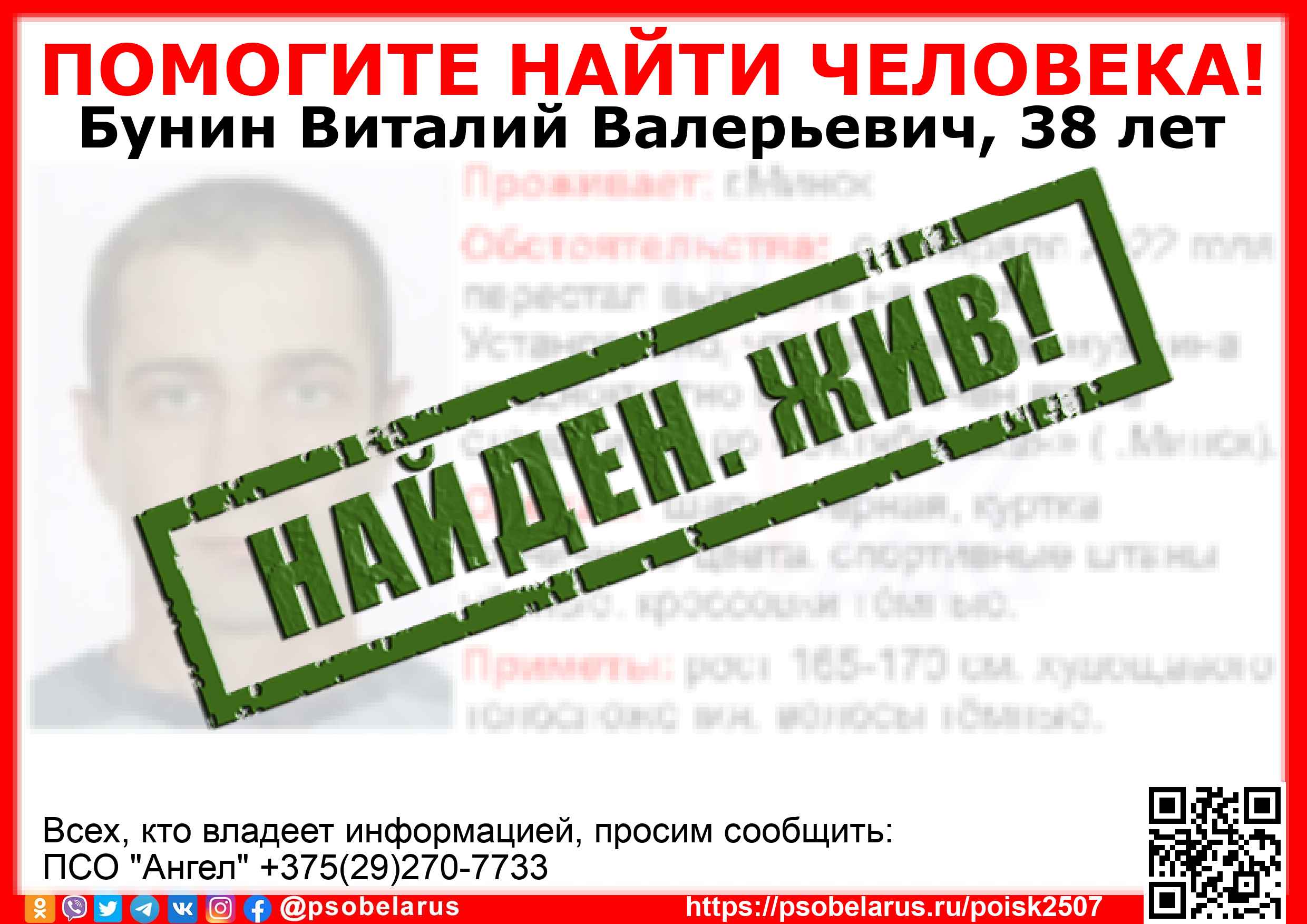 Всех, кто владеет информацией, просим сообщить: ПСО "Ангел" +375(29)270-7733 |