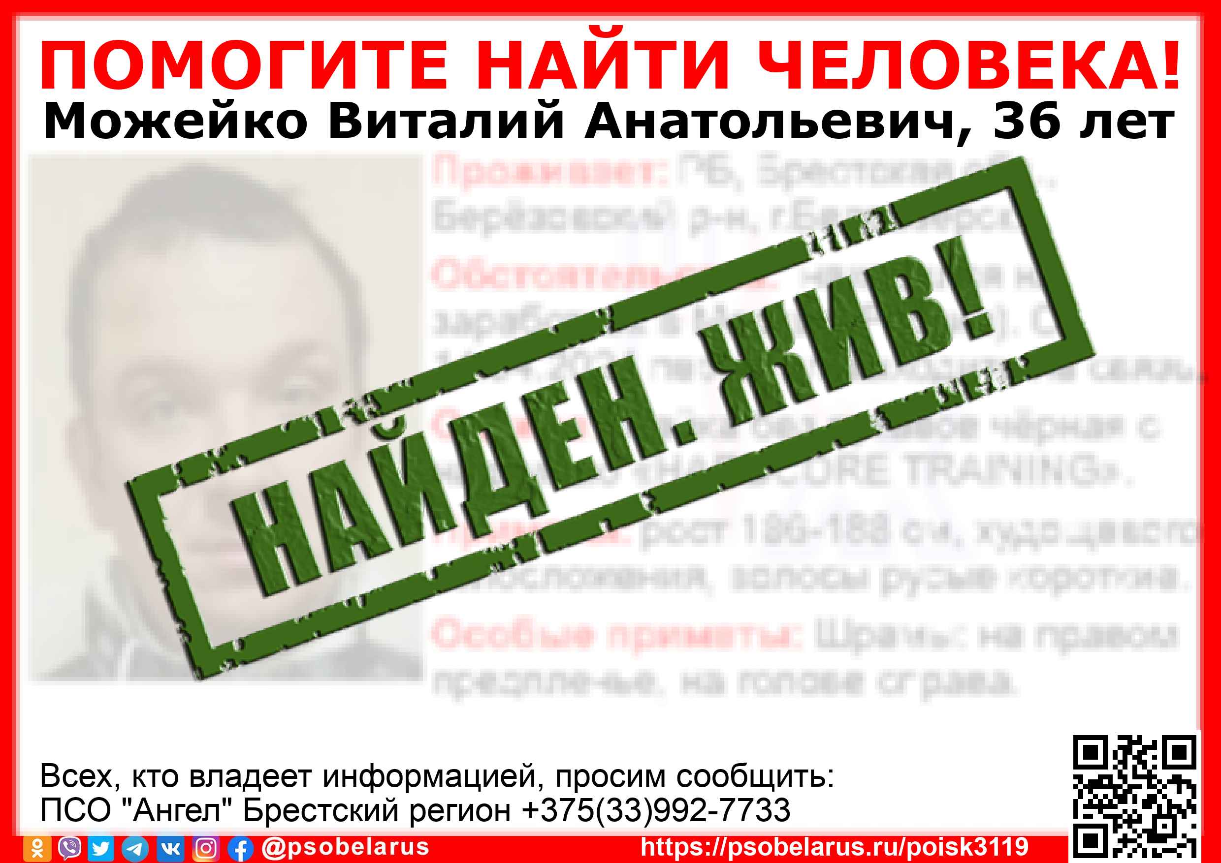 Всех, кто владеет информацией, просим сообщить: ПСО "Ангел" Брестский регион +375(33)992-7733 |