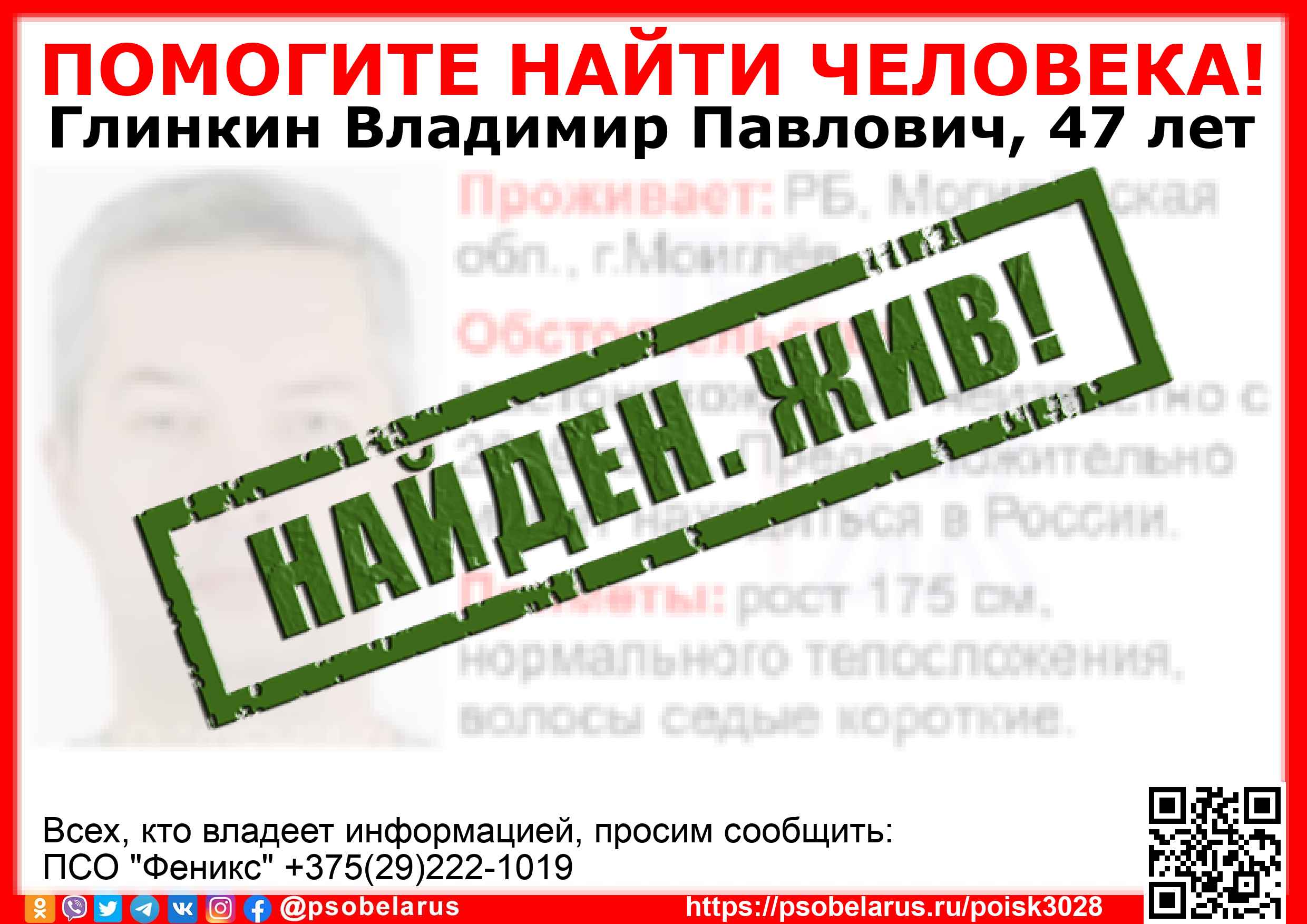 Всех, кто владеет информацией, просим сообщить: ПСО "Феникс" +375(29)222-1019 |