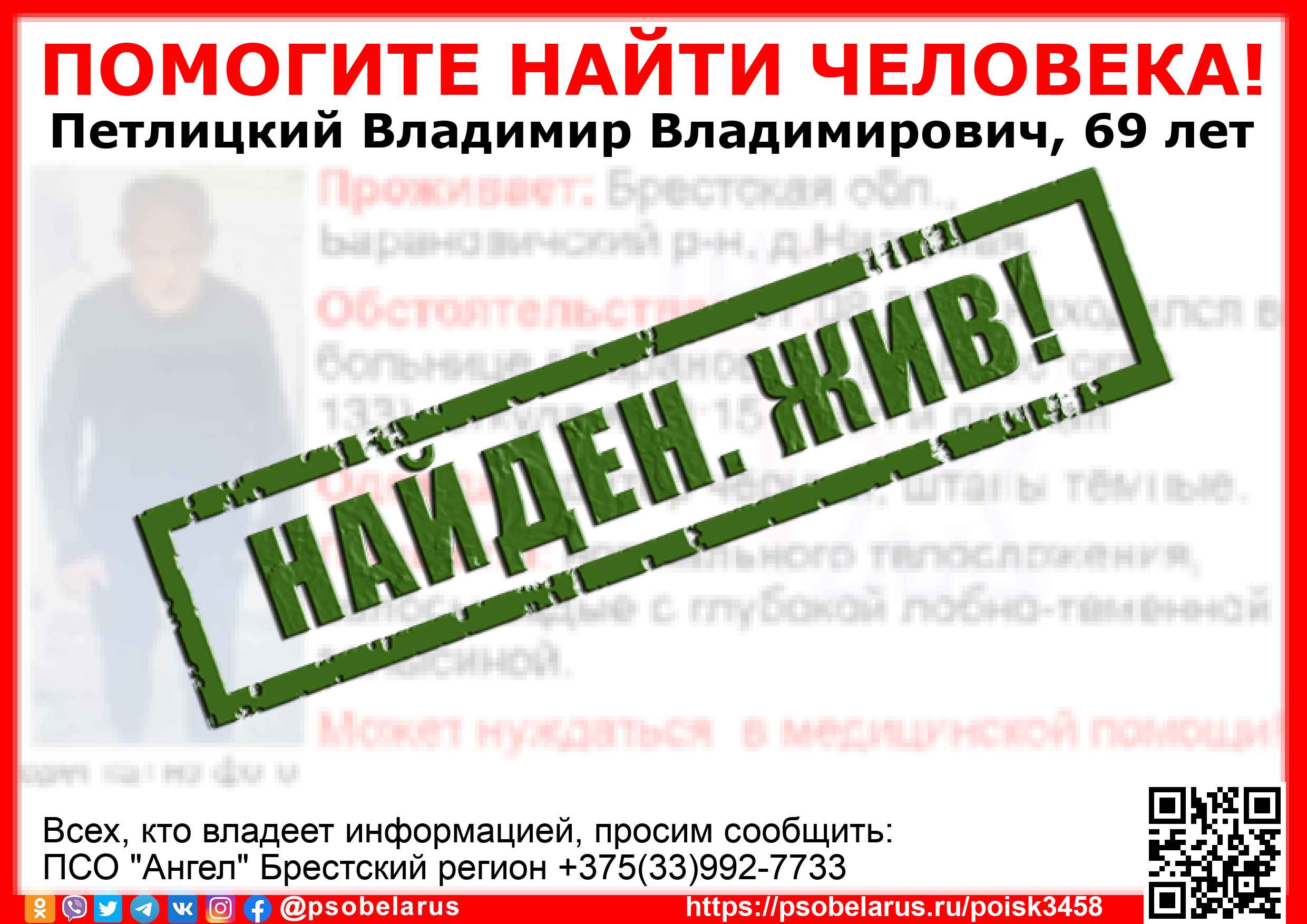 Всех, кто владеет информацией, просим сообщить: ПСО "Ангел" Брестский регион +375(33)992-7733 |