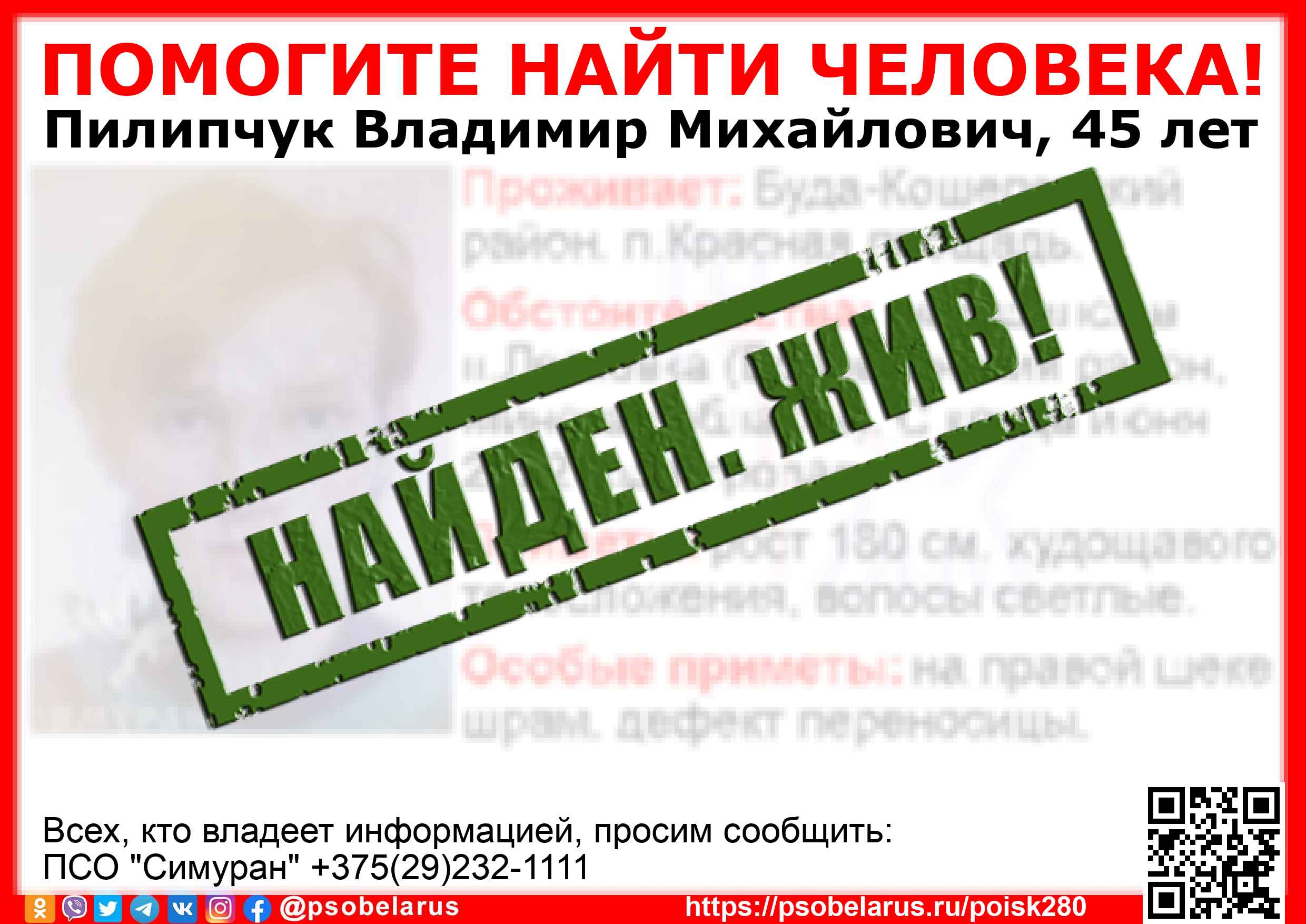 Всех, кто владеет информацией, просим сообщить: ПСО "Симуран" +375(29)232-1111 |