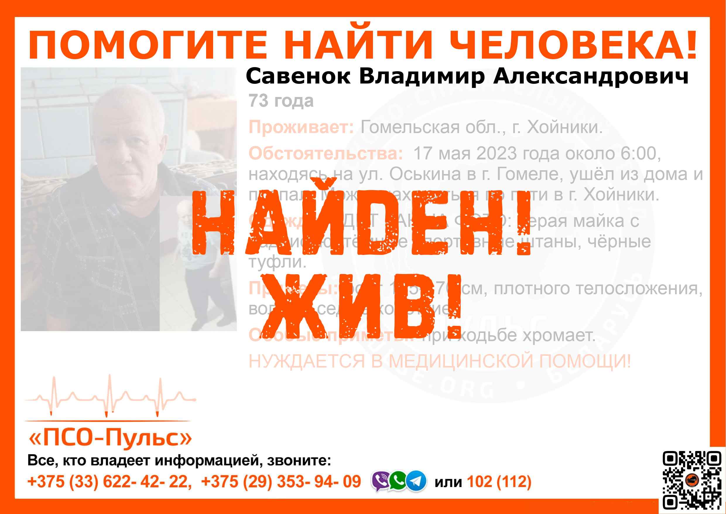 Всех, кто владеет информацией, просим сообщить: ПСО "ПСО-Пульс" +375(33)622-4222 |