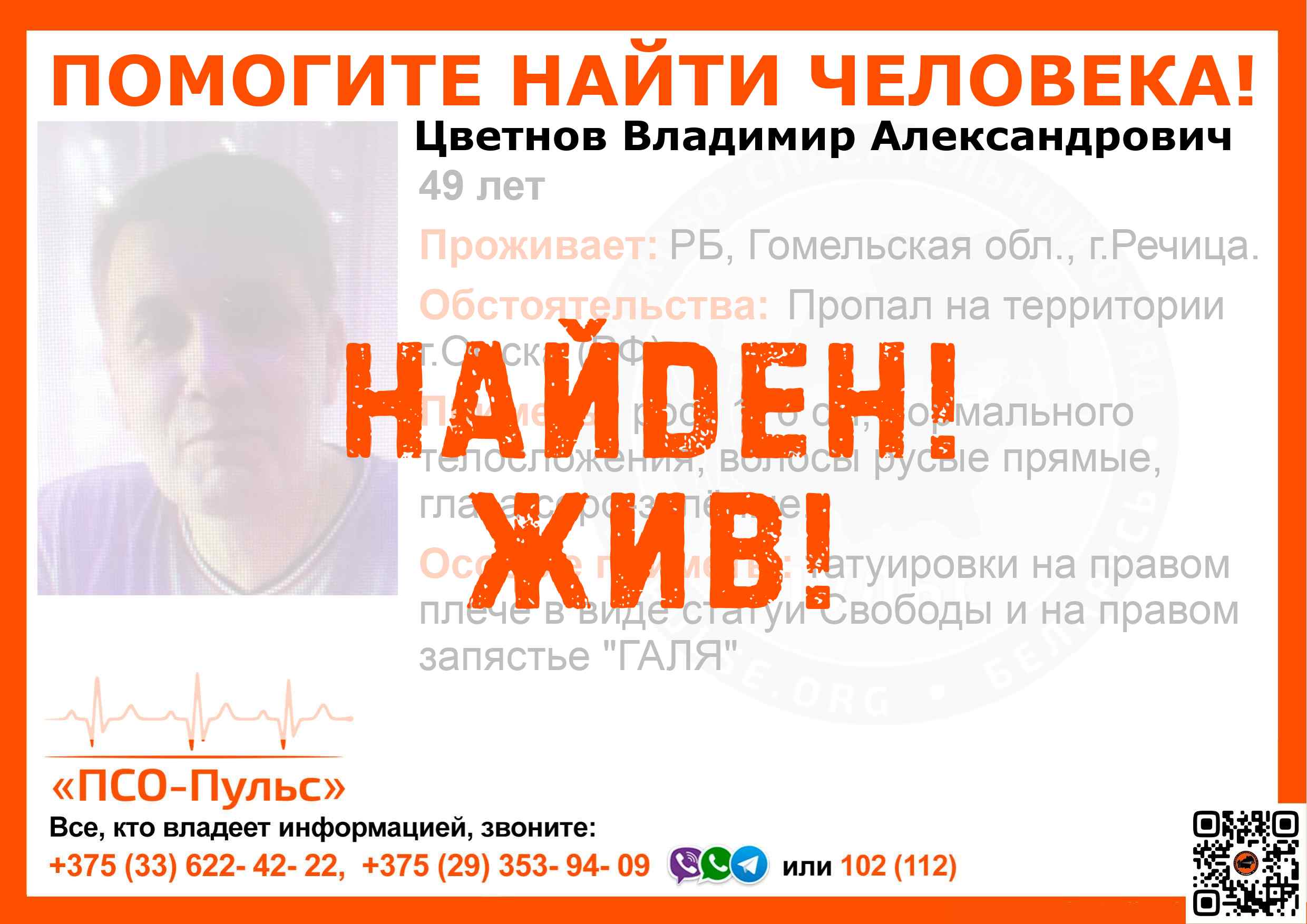 Всех, кто владеет информацией, просим сообщить: ПСО "ПСО-Пульс" +375(33)622-4222 |