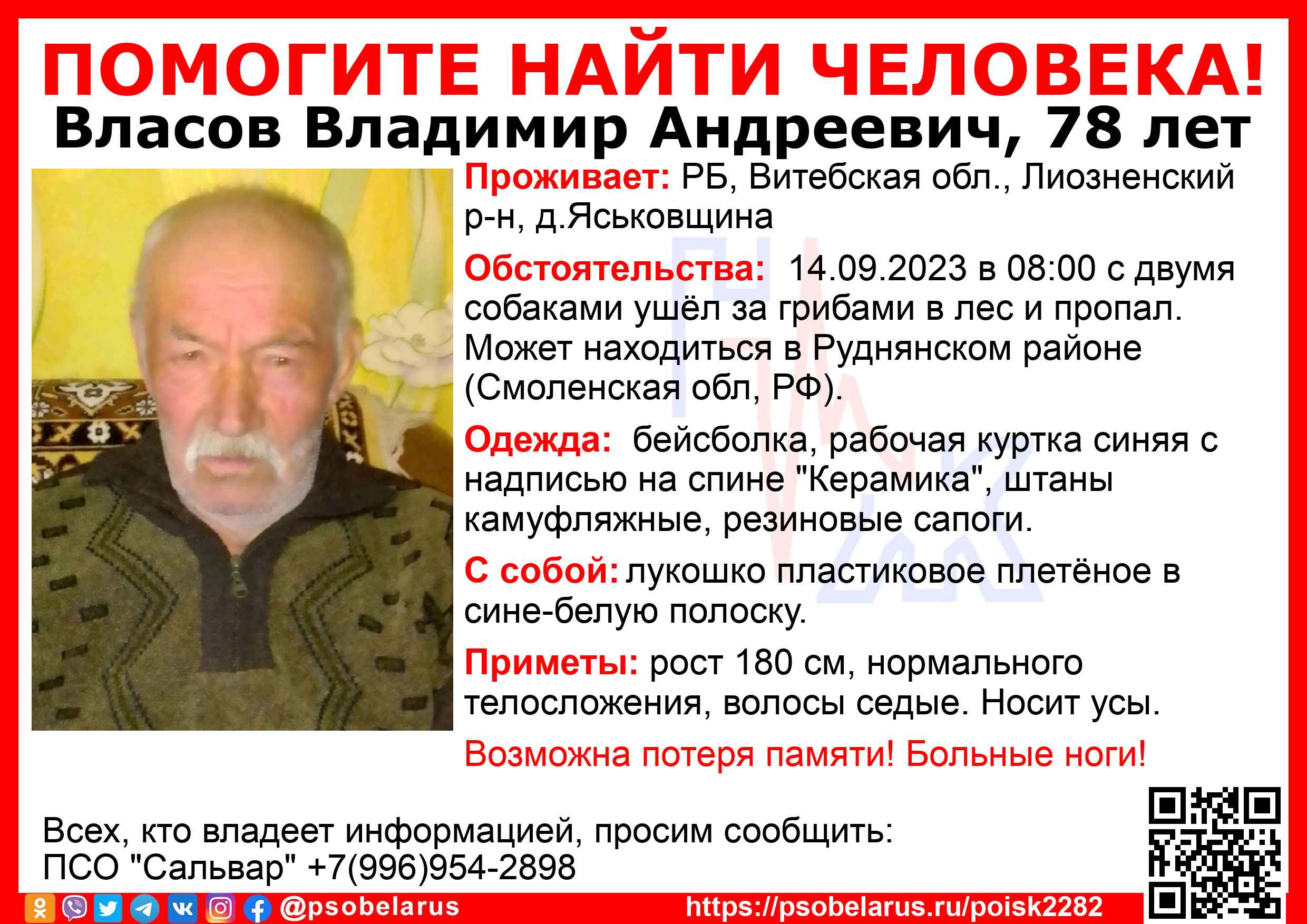 14.09.2023 в 08:00 с двумя собаками ушёл за грибами в лес и пропал. Может находиться в Руднянском районе (Смоленская обл, РФ).