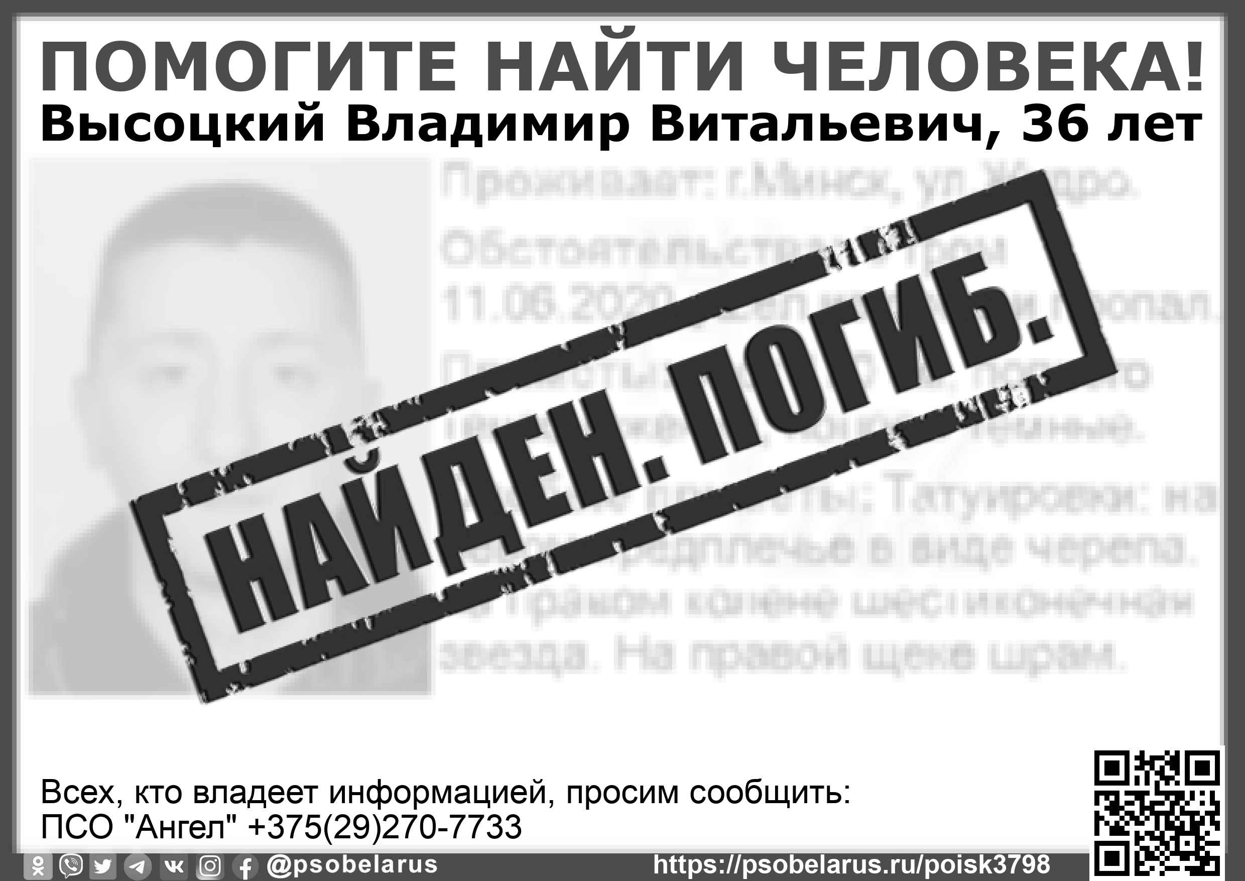 Всех, кто владеет информацией, просим сообщить: ПСО "Ангел" +375(29)270-7733 |