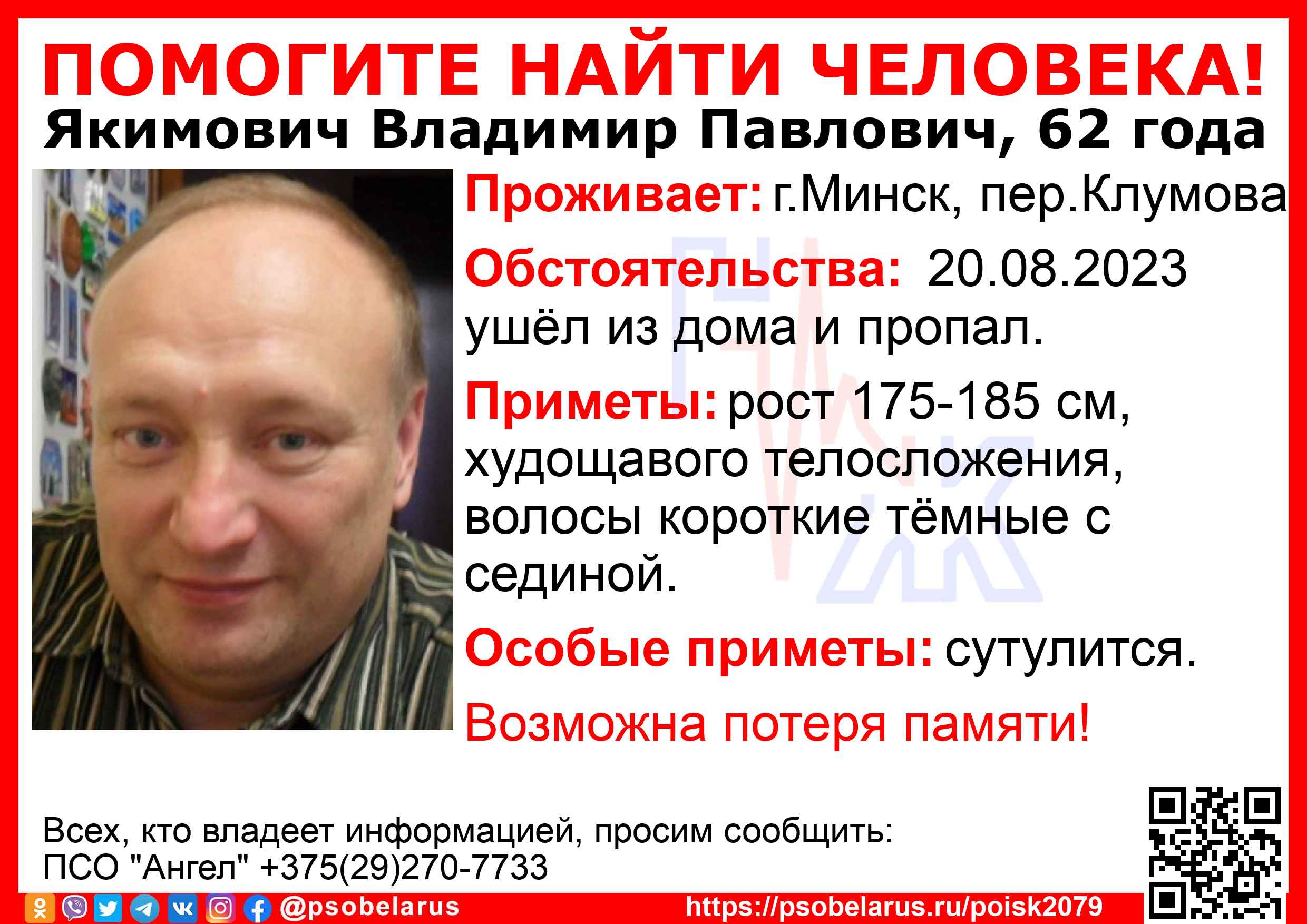 Всех, кто владеет информацией, просим сообщить: ПСО "Ангел" +375(29)270-7733 |