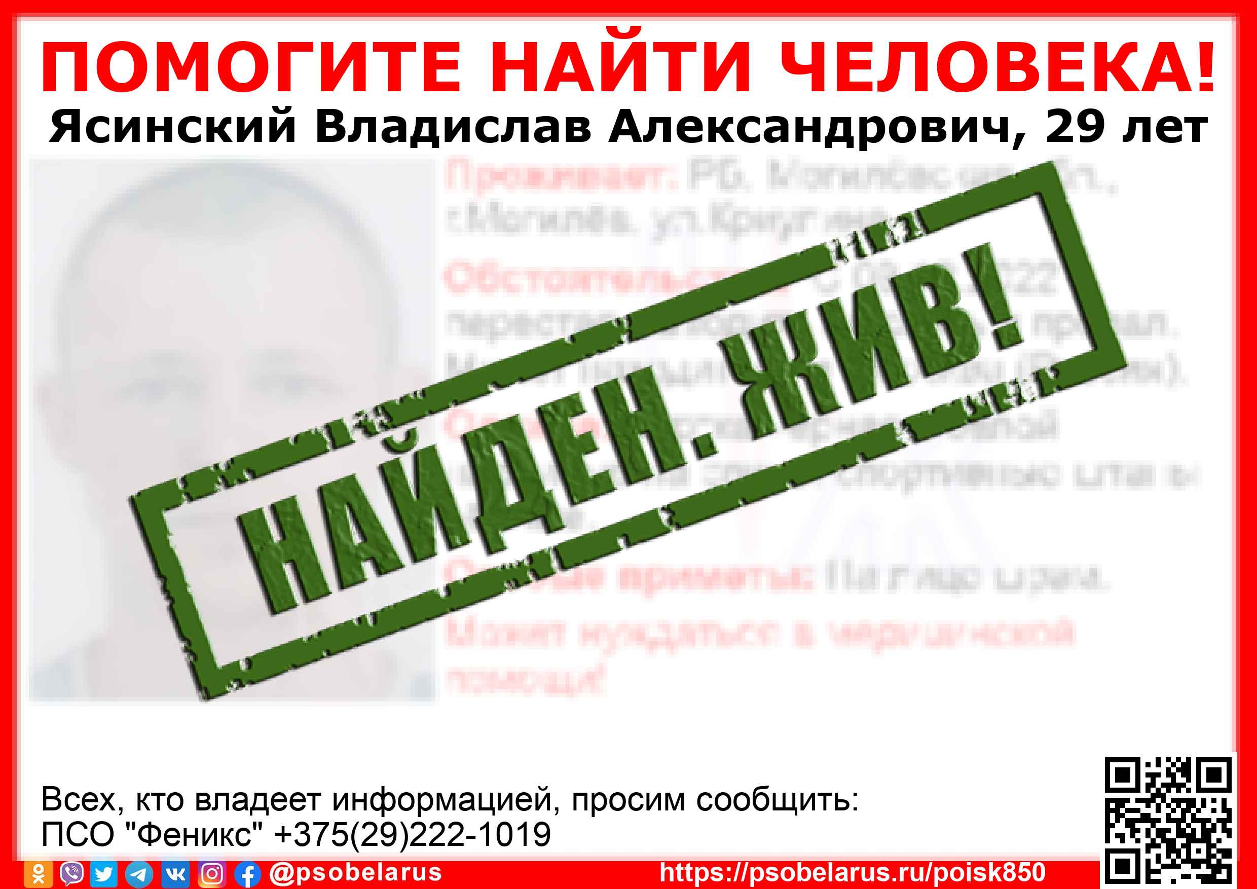 Всех, кто владеет информацией, просим сообщить: ПСО "Феникс" +375(29)222-1019 |