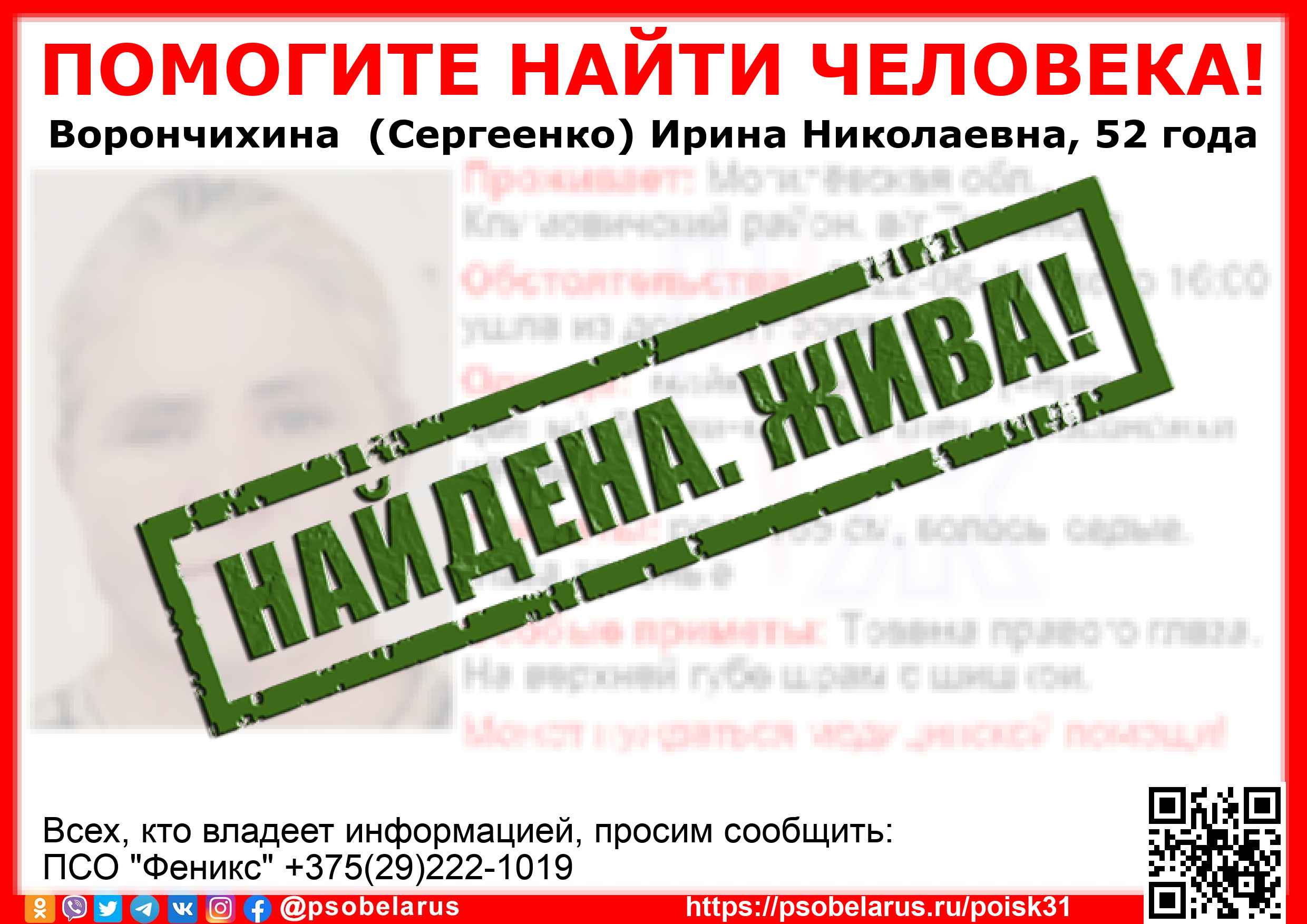 Всех, кто владеет информацией, просим сообщить: ПСО "Феникс" +375(29)222-1019 |