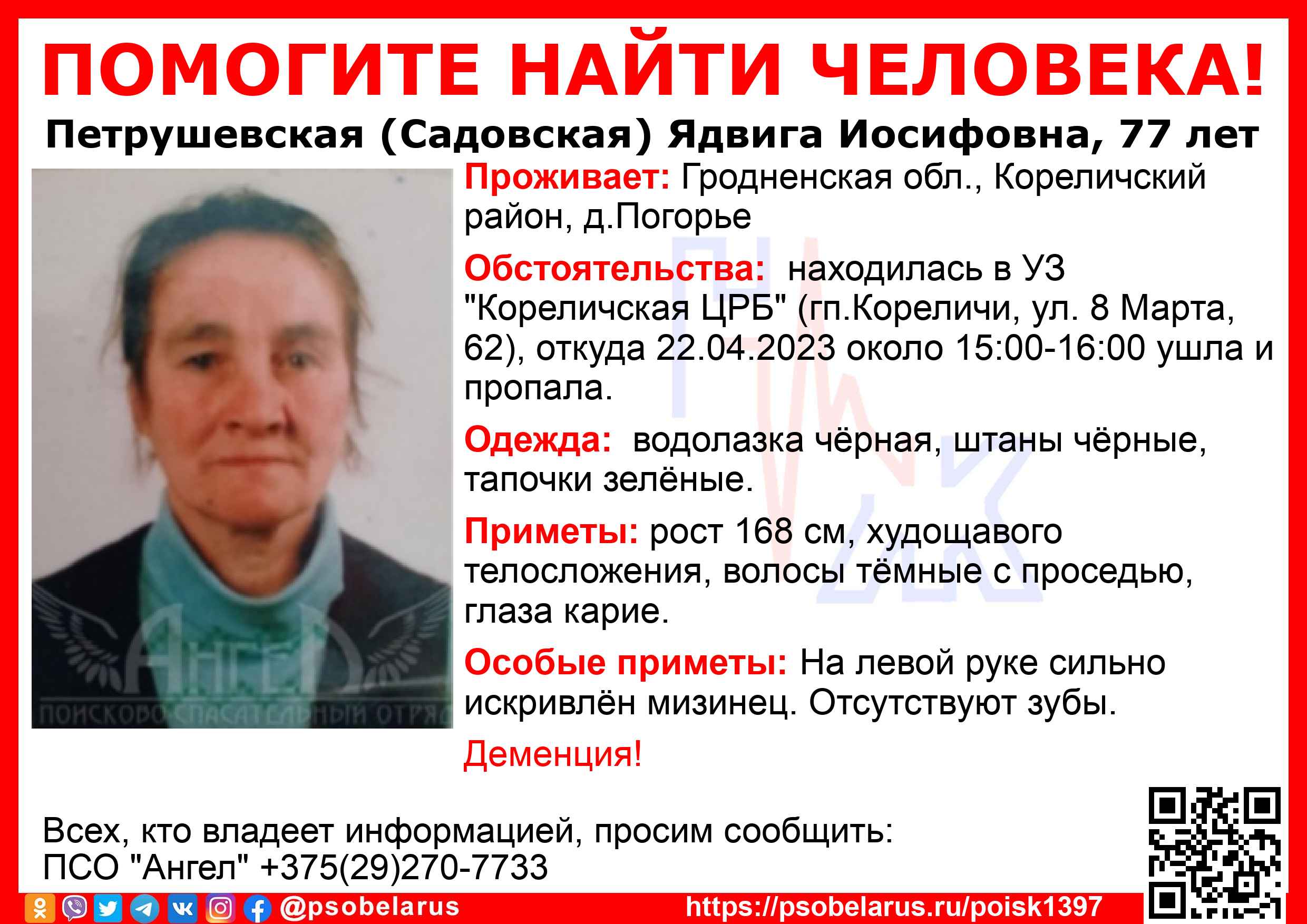 Всех, кто владеет информацией, просим сообщить: ПСО "Ангел" +375(29)270-7733 |
