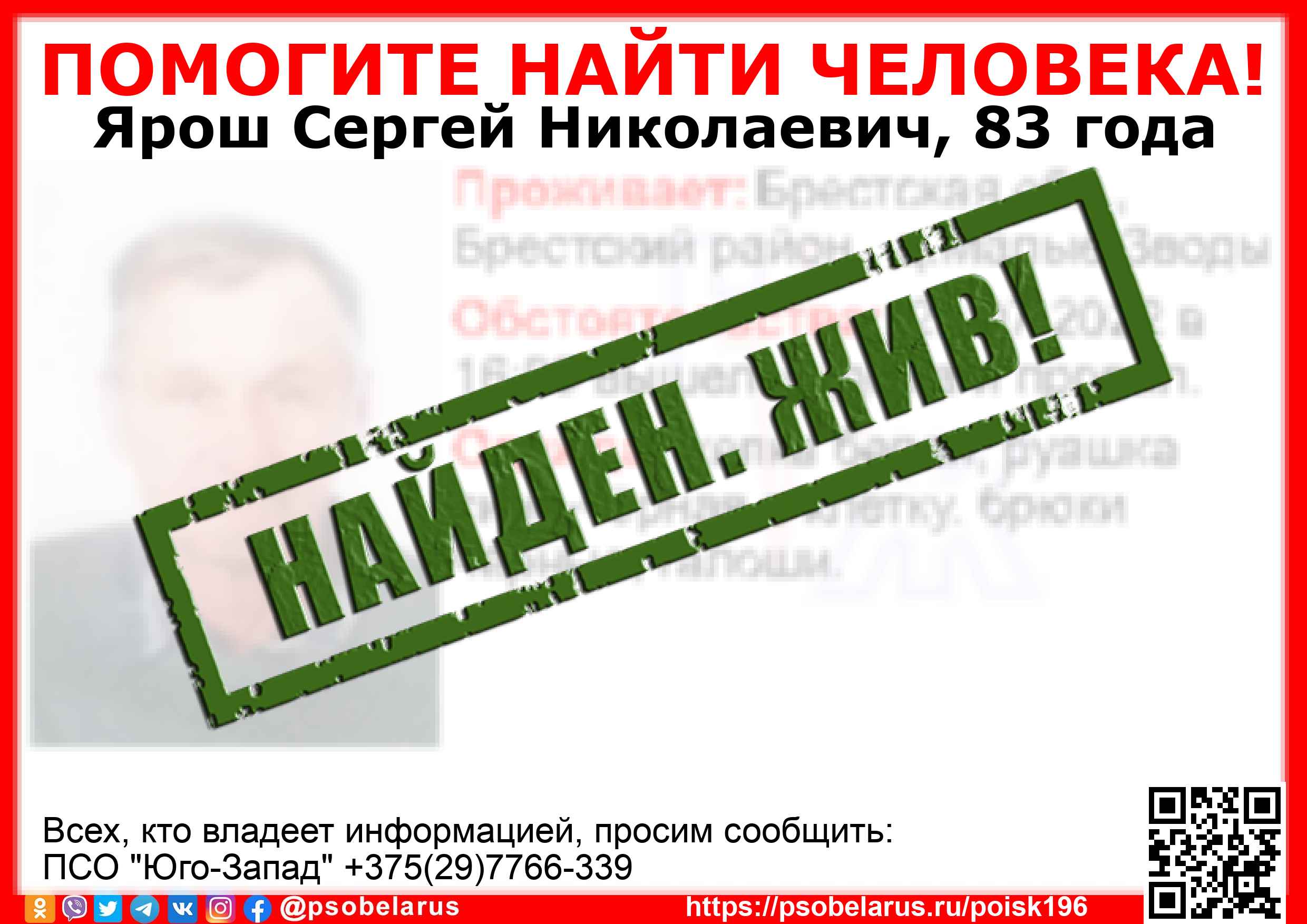 Всех, кто владеет информацией, просим сообщить: ПСО "Юго-Запад" +375(29)7766-339 |