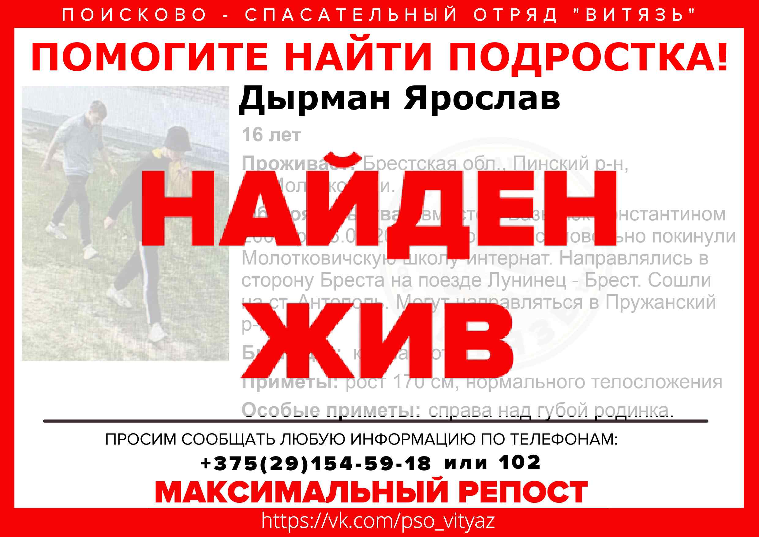 Всех, кто владеет информацией, просим сообщить: ПСО "ВИТЯЗЬ" +375(29)154-59-18 |