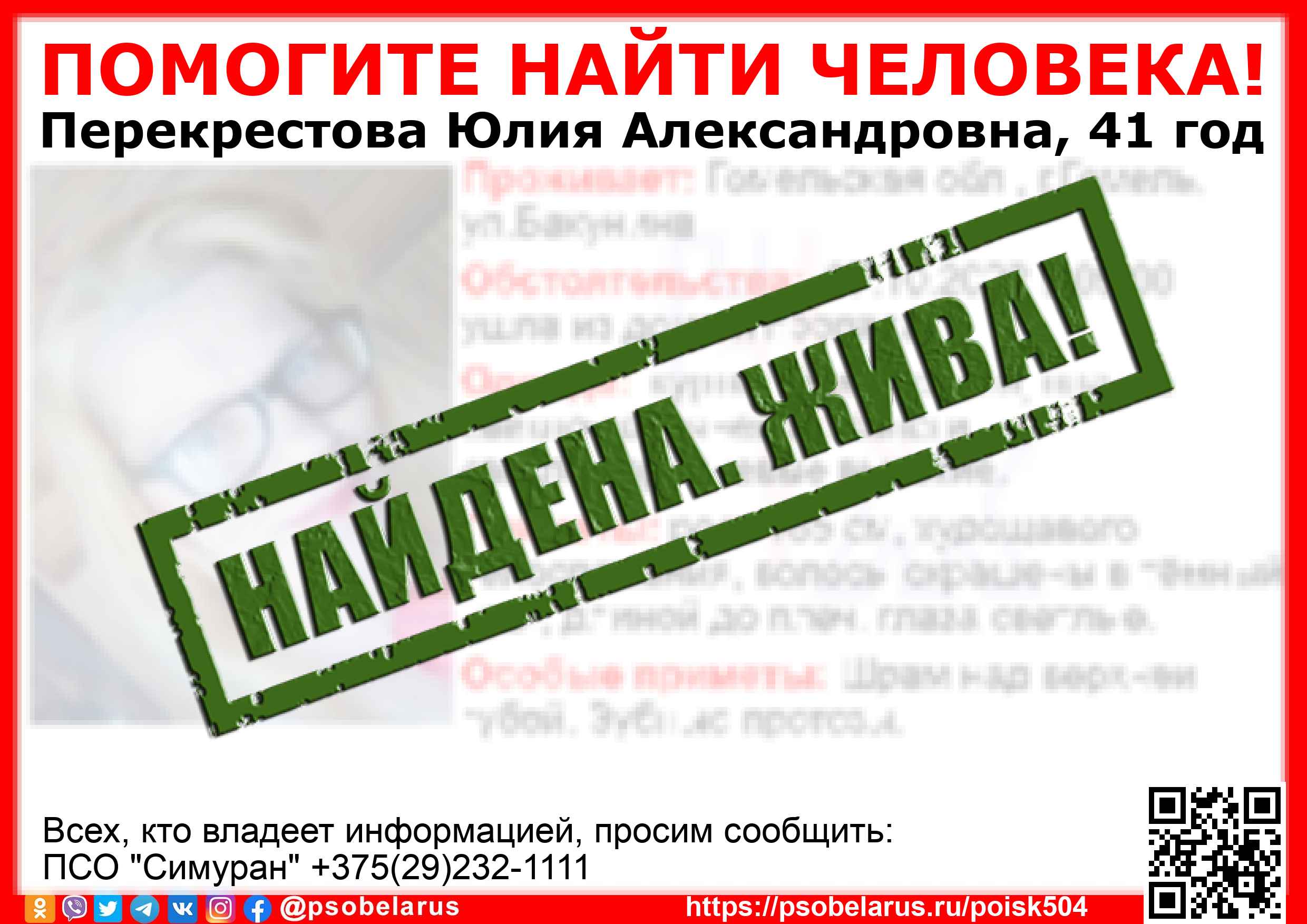 | Всех, кто владеет информацией, просим сообщить: ПСО "Симуран" +375(29)232-1111 |  |