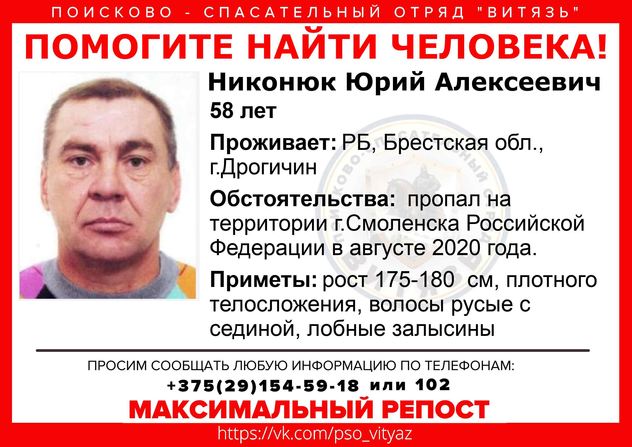 Всех, кто владеет информацией, просим сообщить: ПСО "ВИТЯЗЬ" +375(29)154-59-18 |