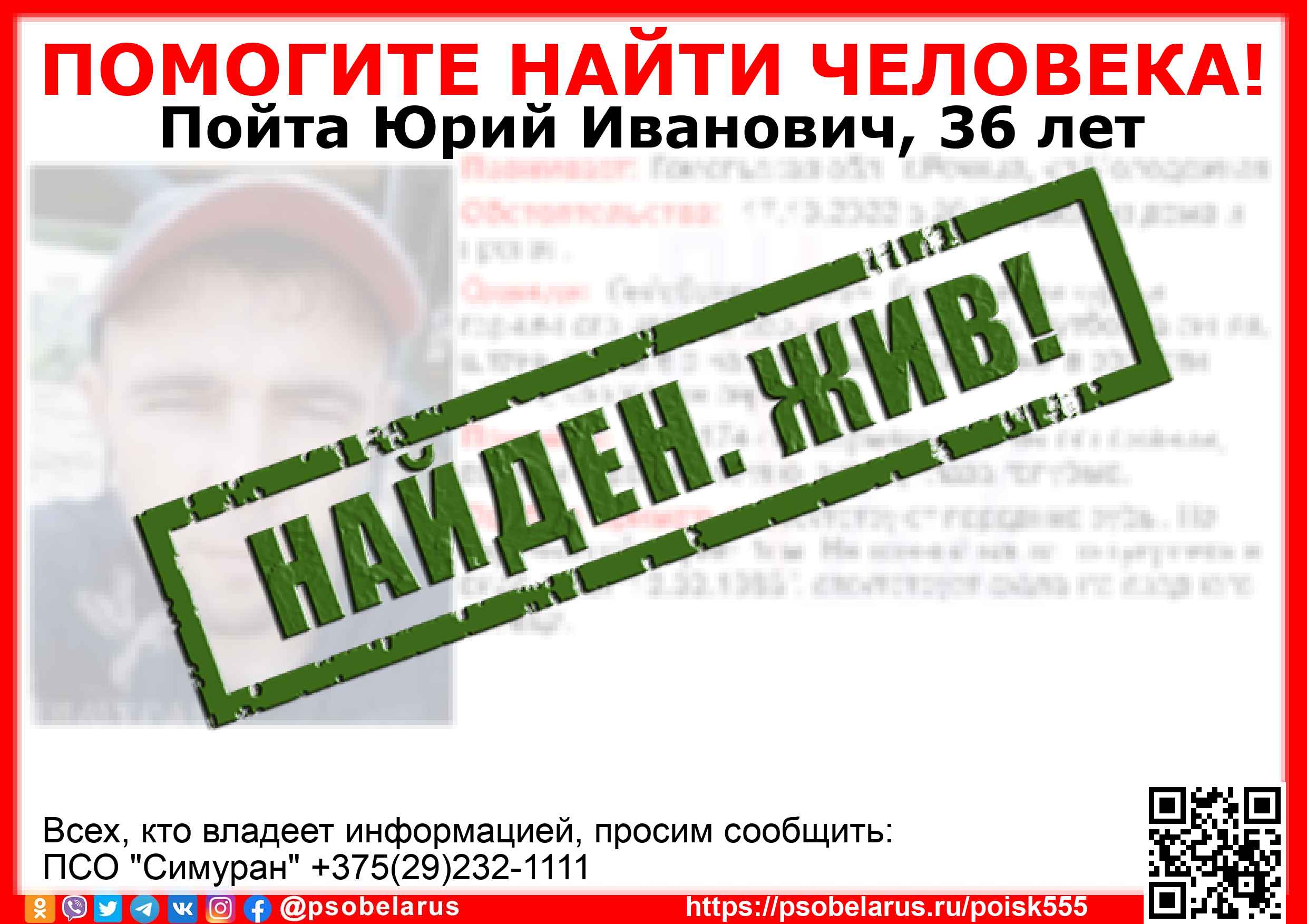 Всех, кто владеет информацией, просим сообщить: ПСО "Симуран" +375(29)232-1111 |