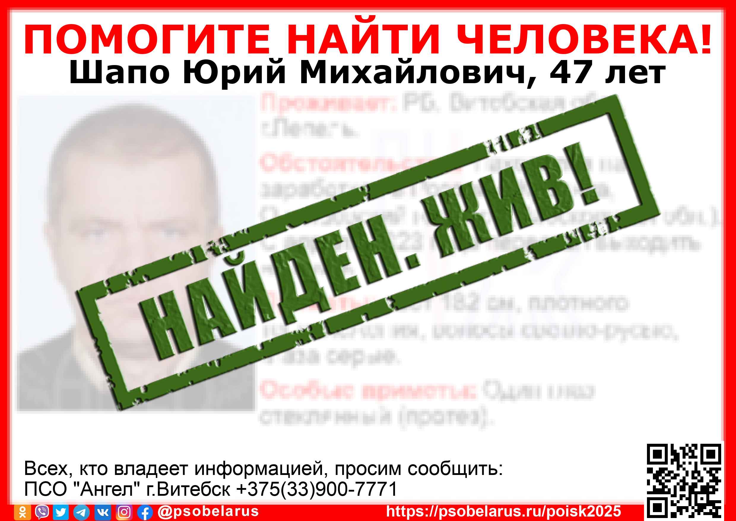 Всех, кто владеет информацией, просим сообщить: ПСО "Ангел" г.Витебск +375(33)900-7771 |