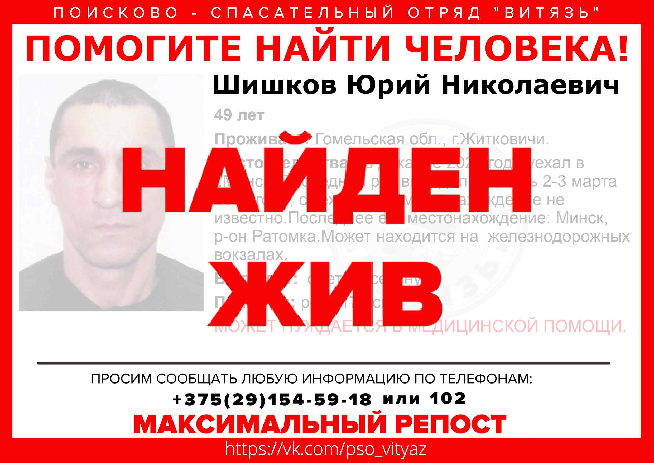 Всех, кто владеет информацией, просим сообщить: ПСО "ВИТЯЗЬ" +375(29)154-59-18 |