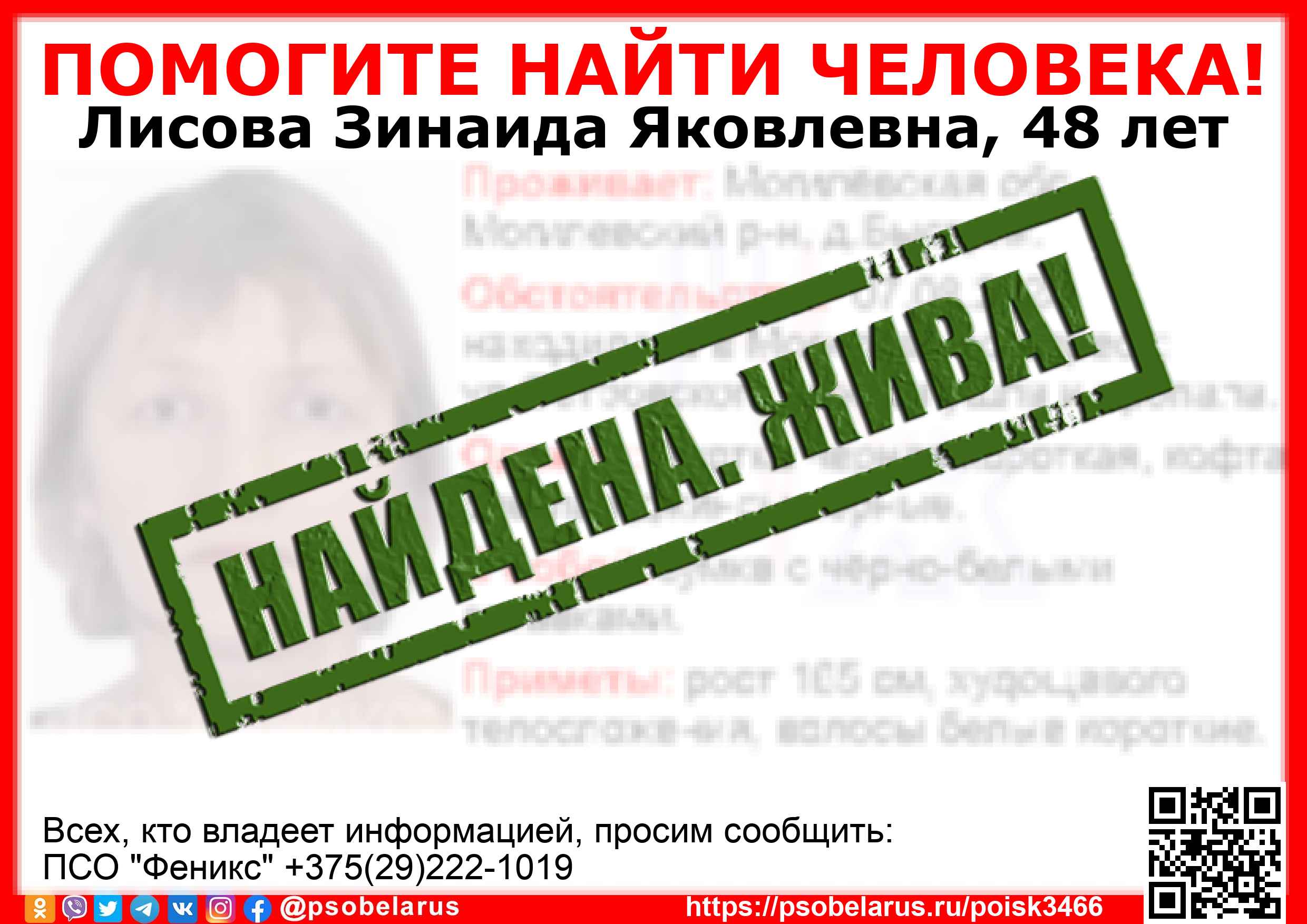 Всех, кто владеет информацией, просим сообщить: ПСО "Феникс" +375(29)222-1019 |