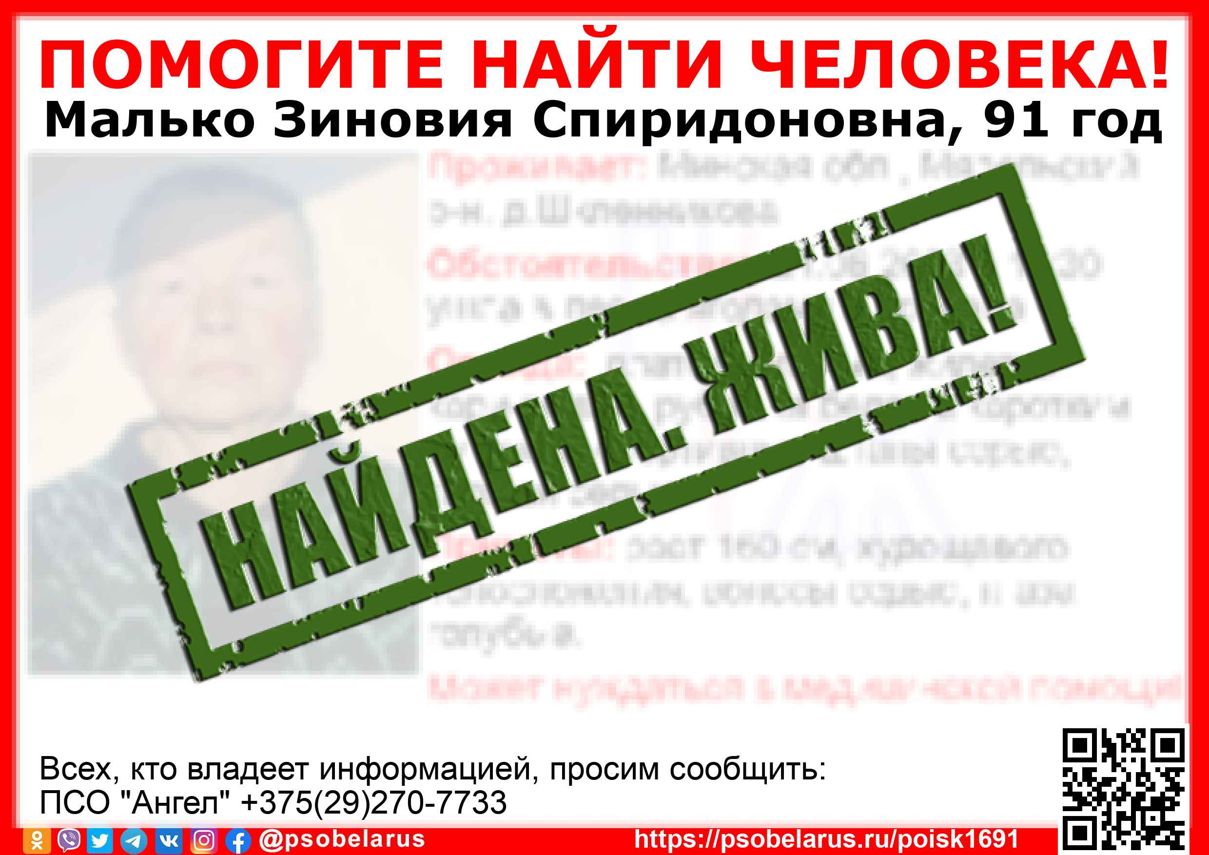 Всех, кто владеет информацией, просим сообщить: ПСО "Ангел" +375(29)270-7733 |
