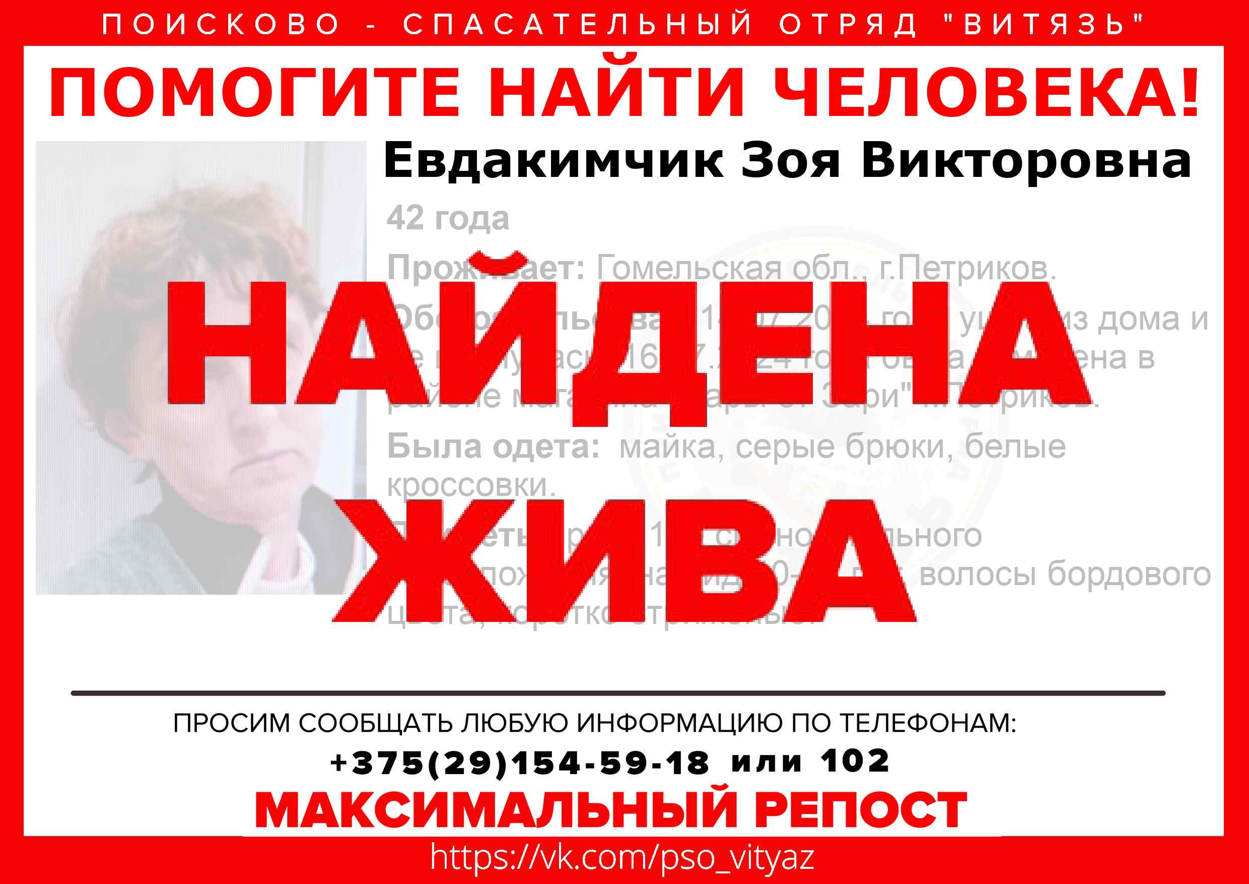 Всех, кто владеет информацией, просим сообщить: ПСО "ВИТЯЗЬ" +375(29)154-59-18 |