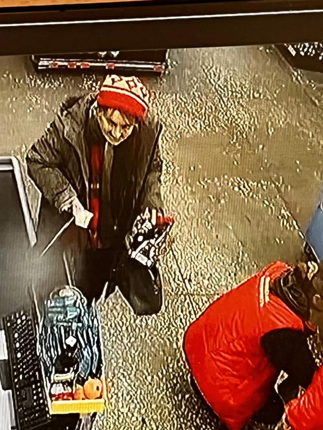 красная шапка с жёлтым орнаментом, коричневое плащёвое пальто, чёрные брюки.